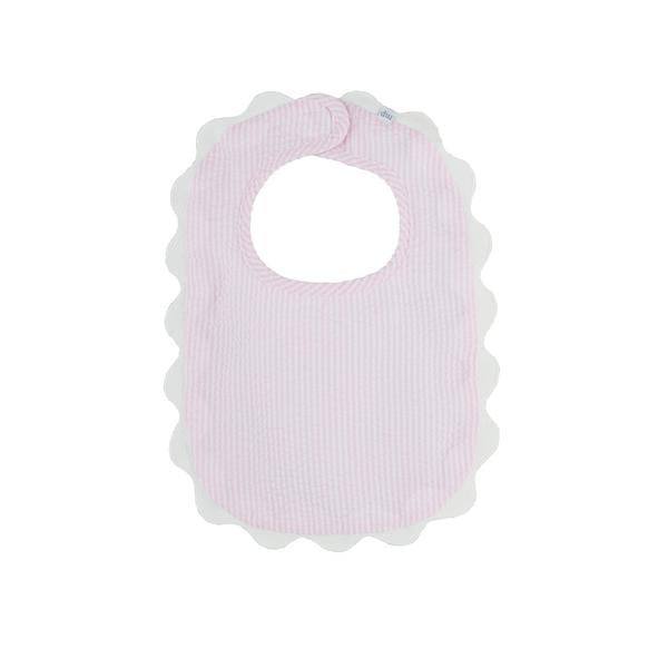 The bib is adorned with an oversized scallop ric-rac trim, adding a touch of whimsy and elegance to its design. The cotton interlock backing ensures a soft and gentle feel against your baby's skin, providing extra comfort and protection. With a convenient hook and loop closure, this bib is easy to put on and take off, making mealtime a breeze. Measuring 12" x 8 1/2", it offers ample coverage to keep your baby's clothes clean. The front of the bib is crafted from a blend of 80% polyester and 20% cotton, offering durability and easy maintenance, while the back is made from 100% cotton for a soft touch. This bib combines style and functionality, making it an essential addition to your baby's wardrobe