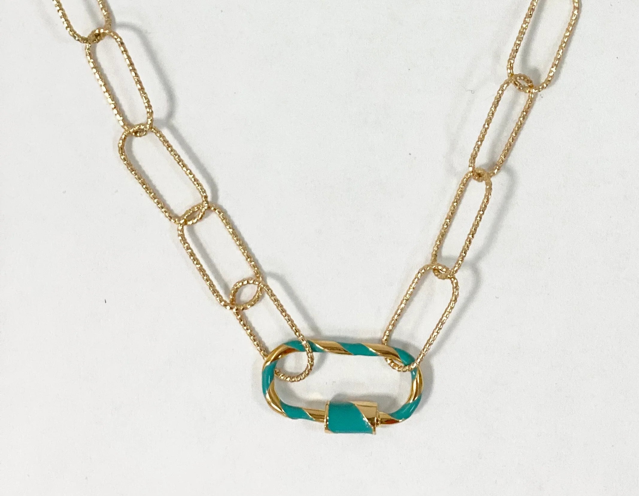 Dazzle your layered stack with the Sydney Necklace. Elongated dainty paperclip chain fastened with metallic carabiner.