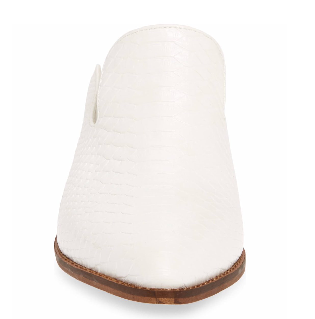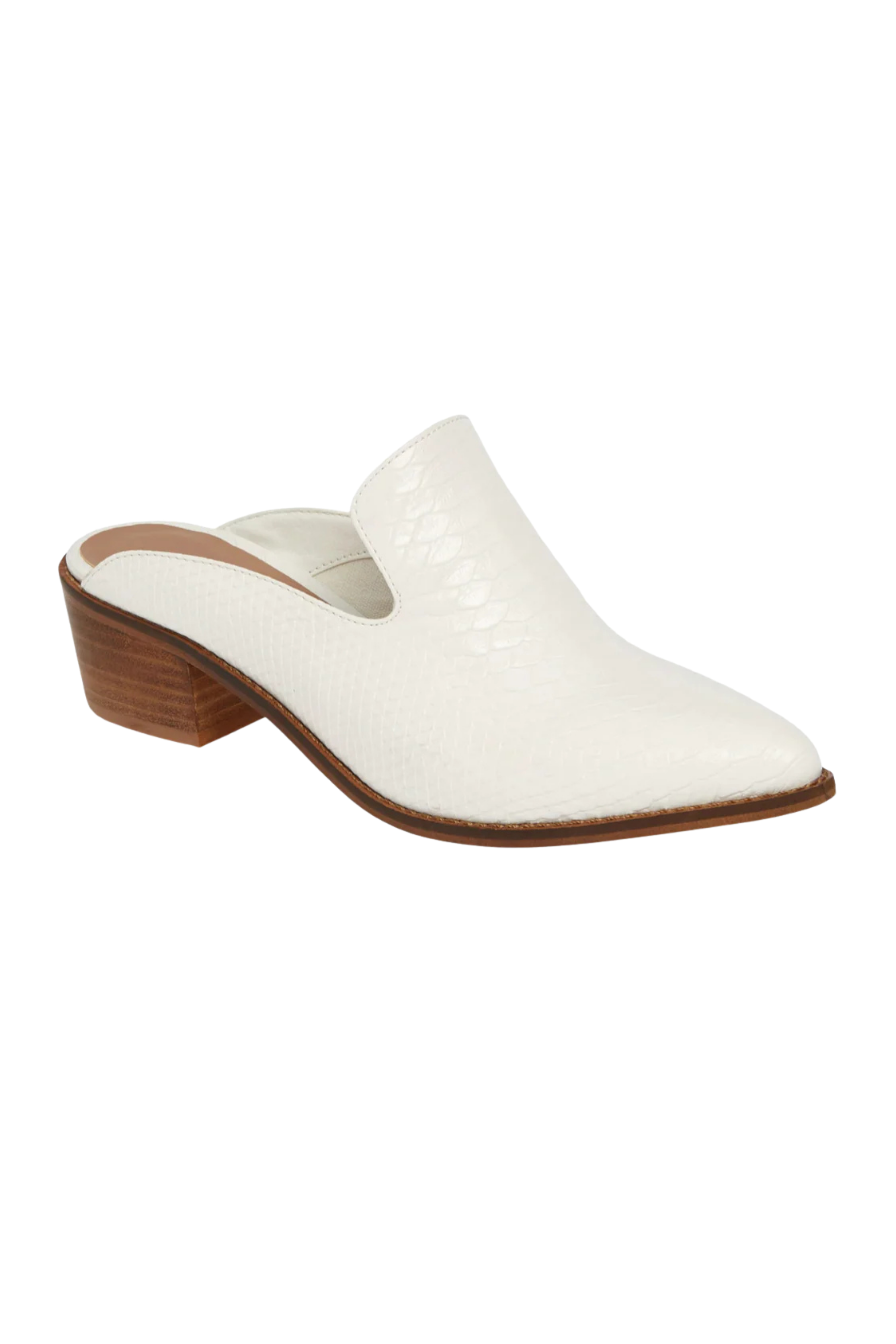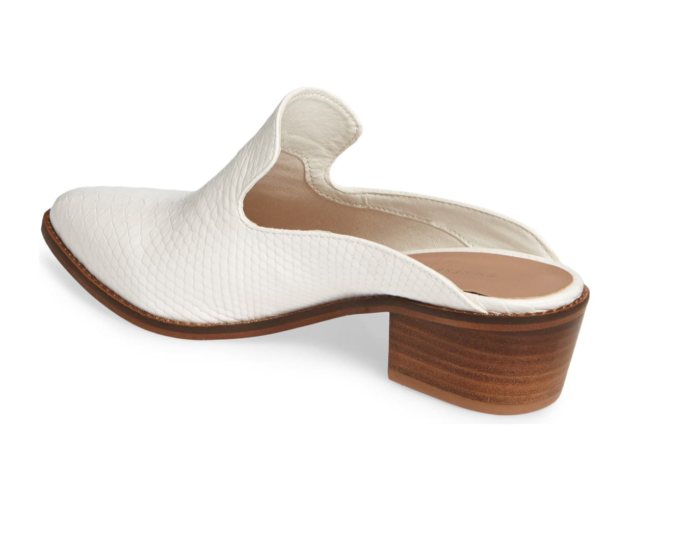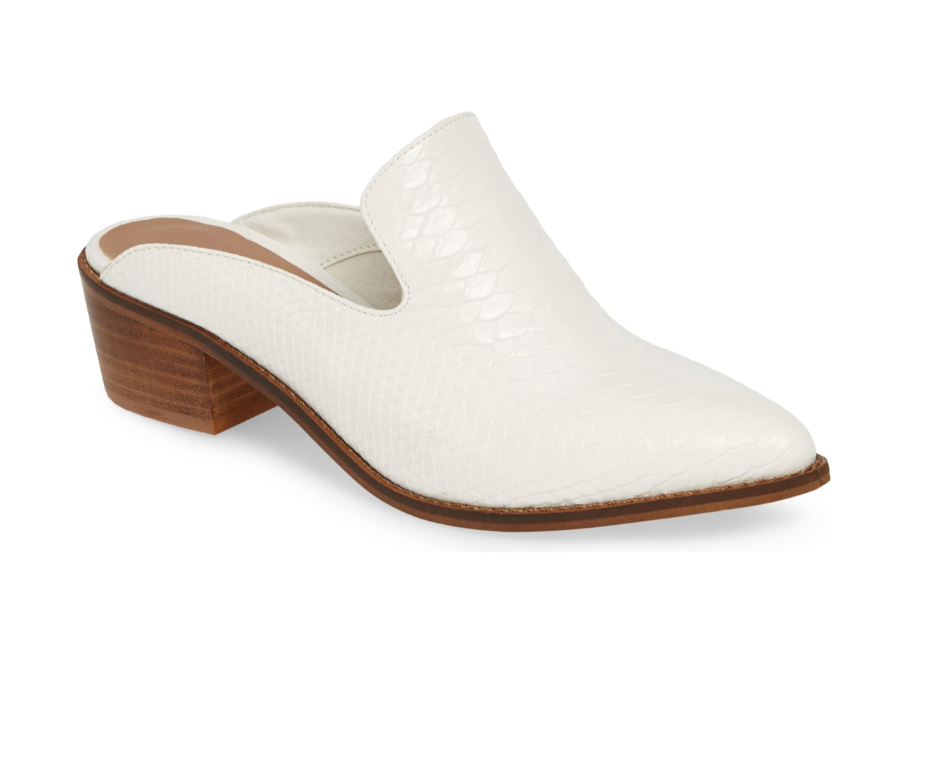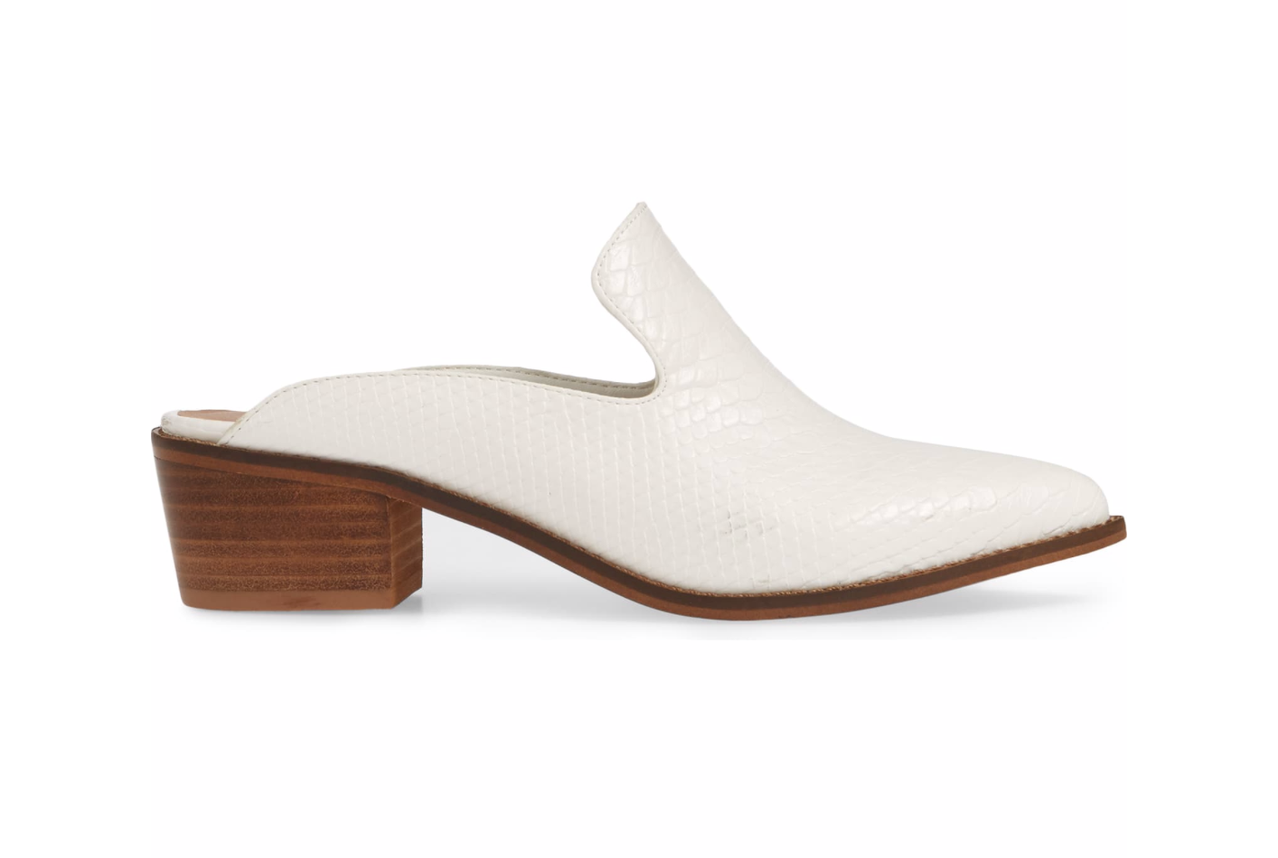 An exaggerated vamp and a softly pointed toe elevate the look—and the fun—of a versatile loafer mule lofted on a stacked block heel.