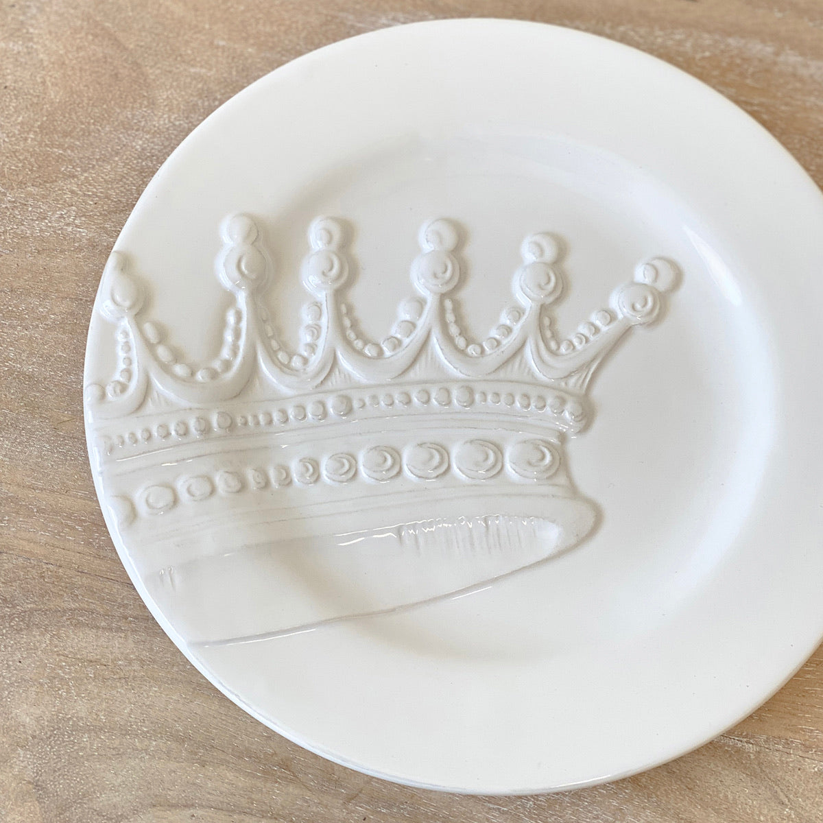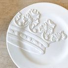 for a Mardi Gras tablescape, this set of 4 white embossed crown plates is so elegant! Each plate features a different style of crown embossed on it and is sure to add some elegance to your table!