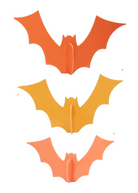 - Bat Halloween decorations measure 8" H x 15" W, 6.5"H x 12.5" W, and 5" H x 9" W, and come in coral, light orange, and orange.
