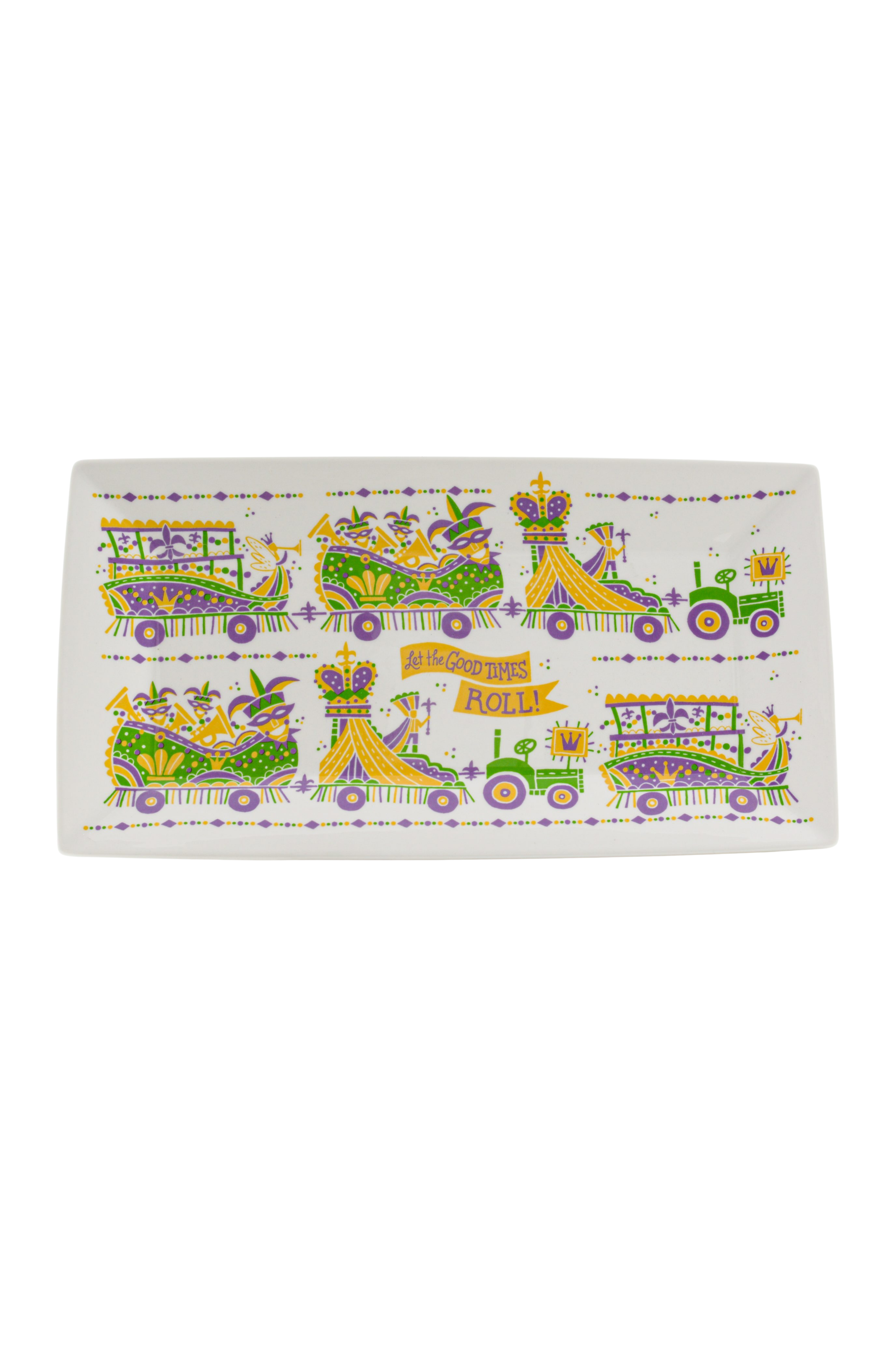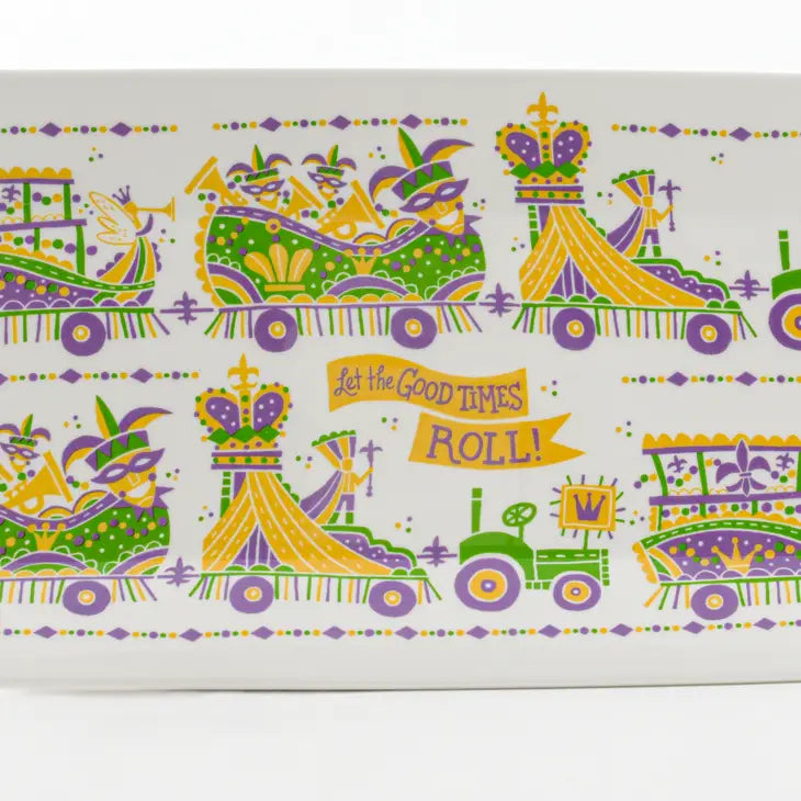A ceramic platter featuring our new Let the Good Times Roll design by artist, Denise Gallagher. As the parades roll your customers will be serving up goodies on this platter featuring Mardi Gras floats.