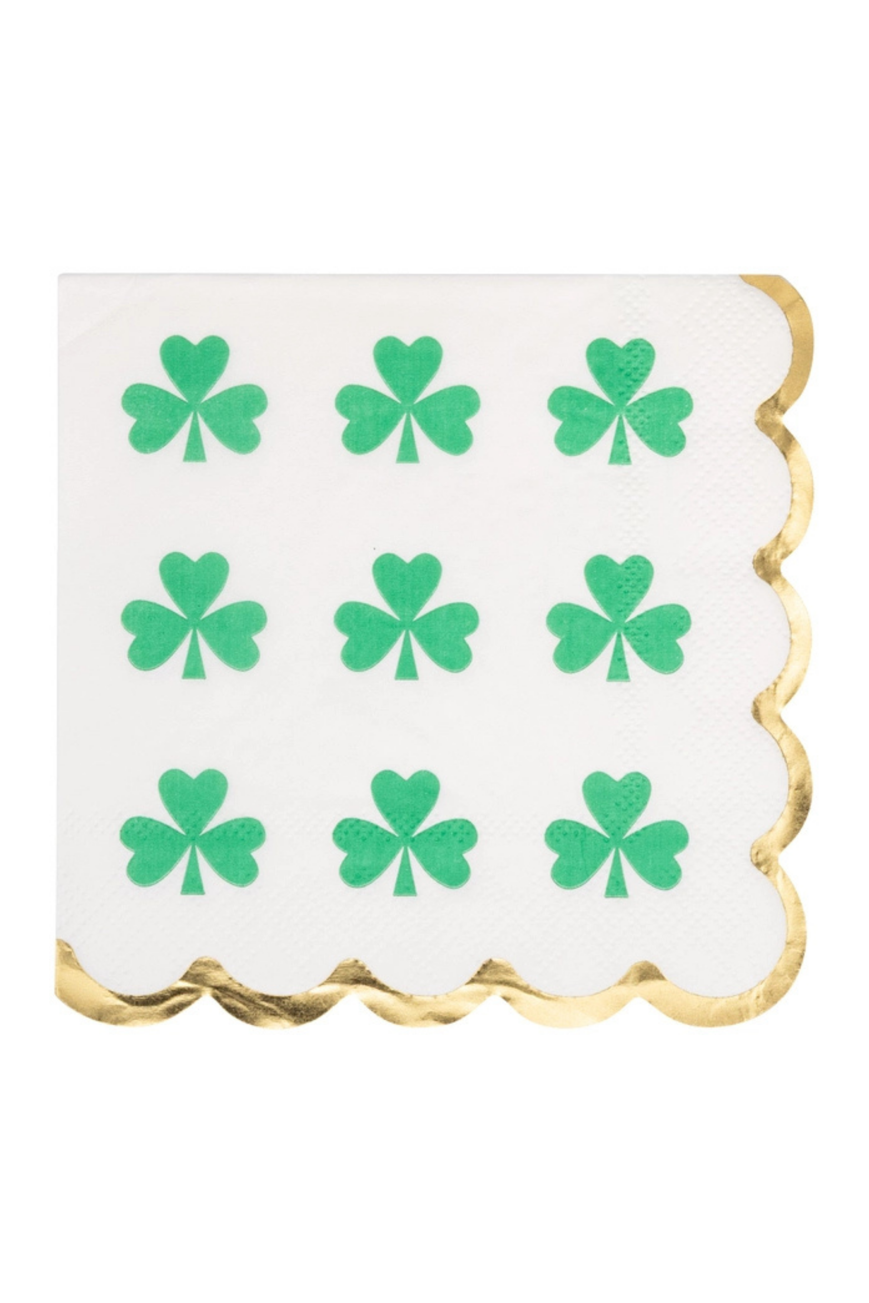 Luck of the Irish meets sophisticated style with this festive cocktail napkin set! Featuring a Nine of Clubs design, these napkins bring playful elegance to your St. Patrick's Day celebration. Perfect for toasting, snacking, and adding a touch of lucky charm to your party table. • Green-on-white shamrock pattern • Gold foil scalloped edges • Includes 18 napkins • Folded napkins measure 5" x 5"