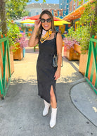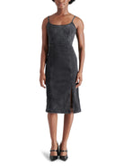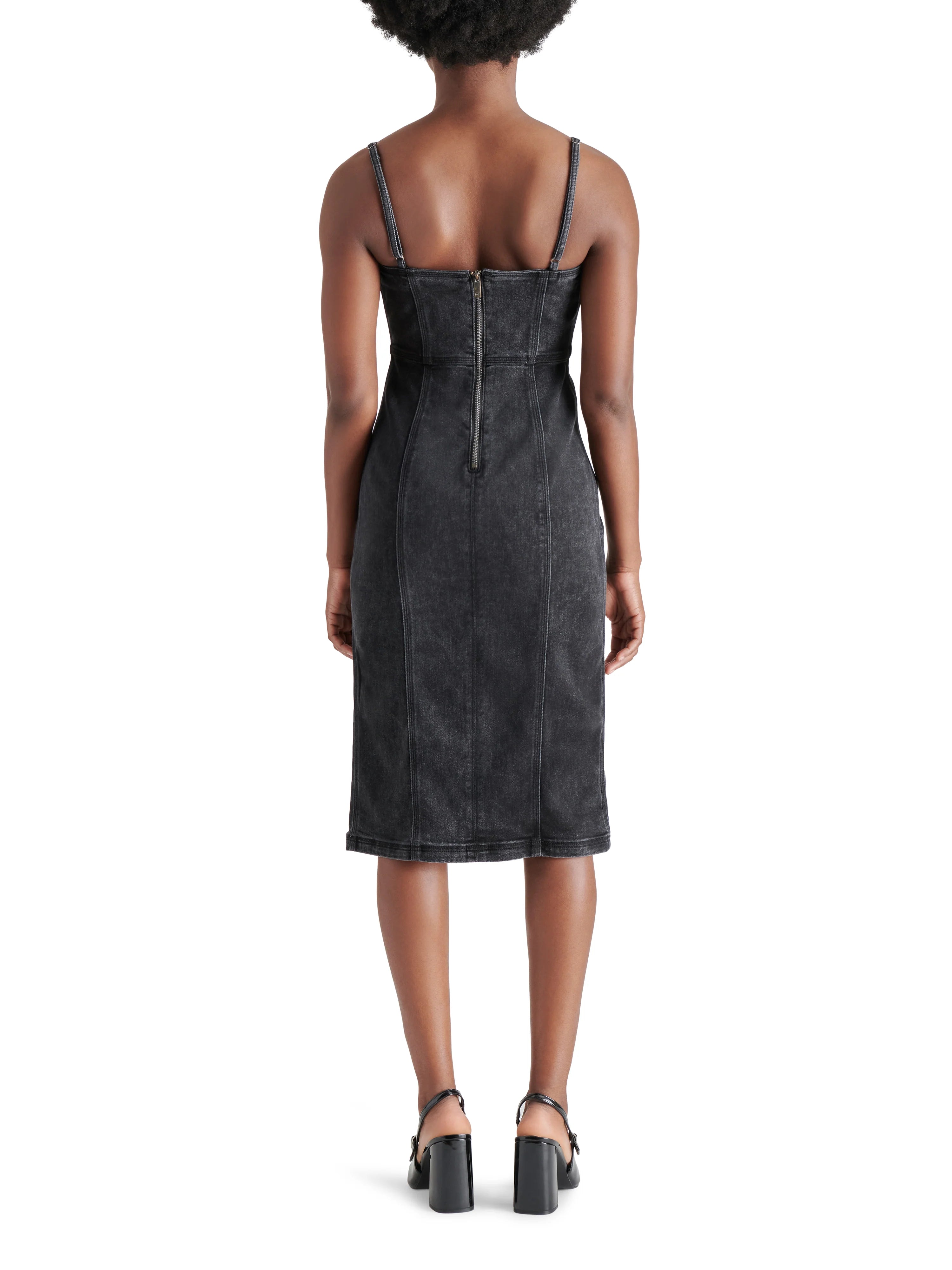 This fitted midi dress features adjustable straps and an exposed back zip closure for a perfect fit. Made from high-quality denim, this dress is both stylish and comfortable.