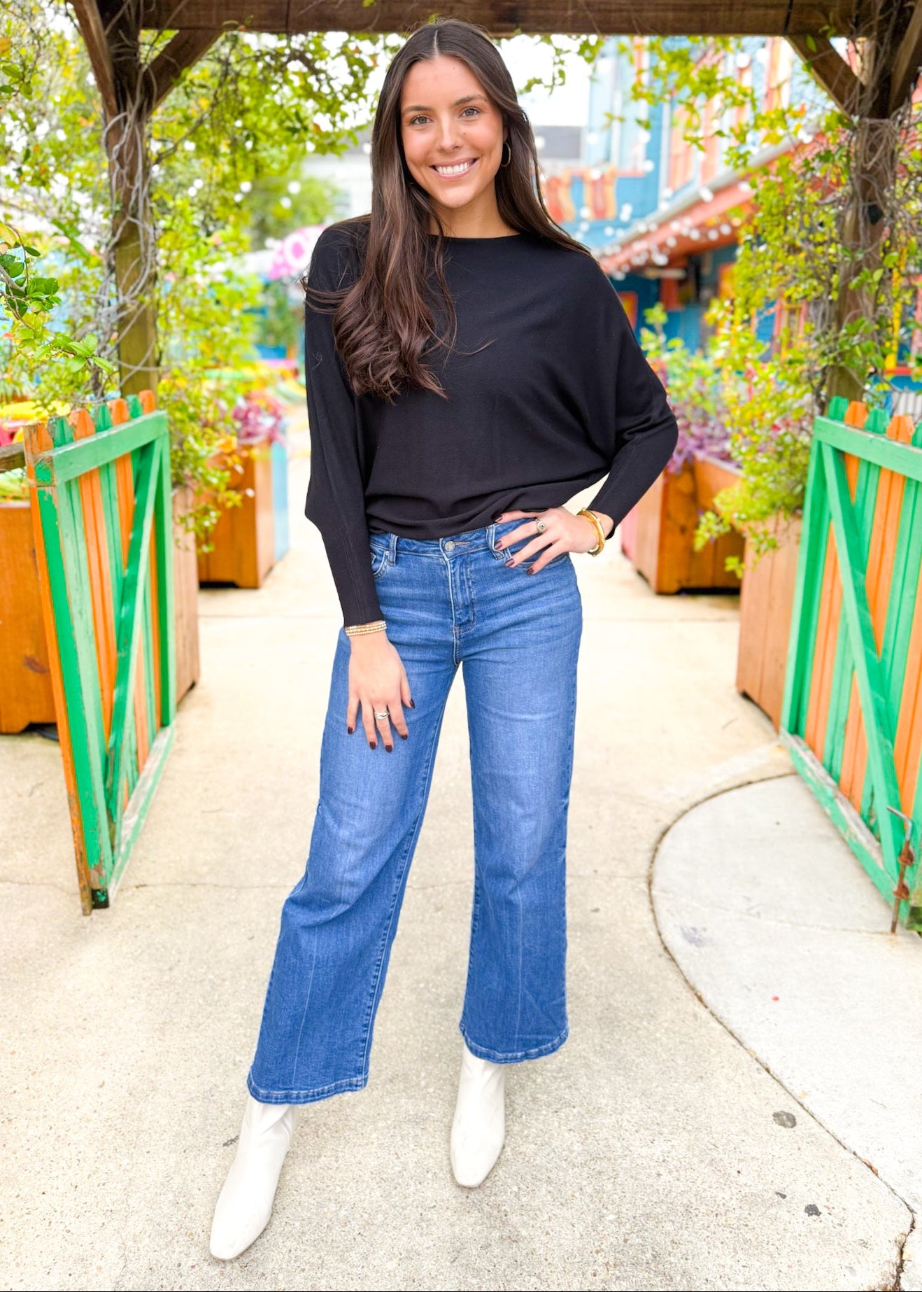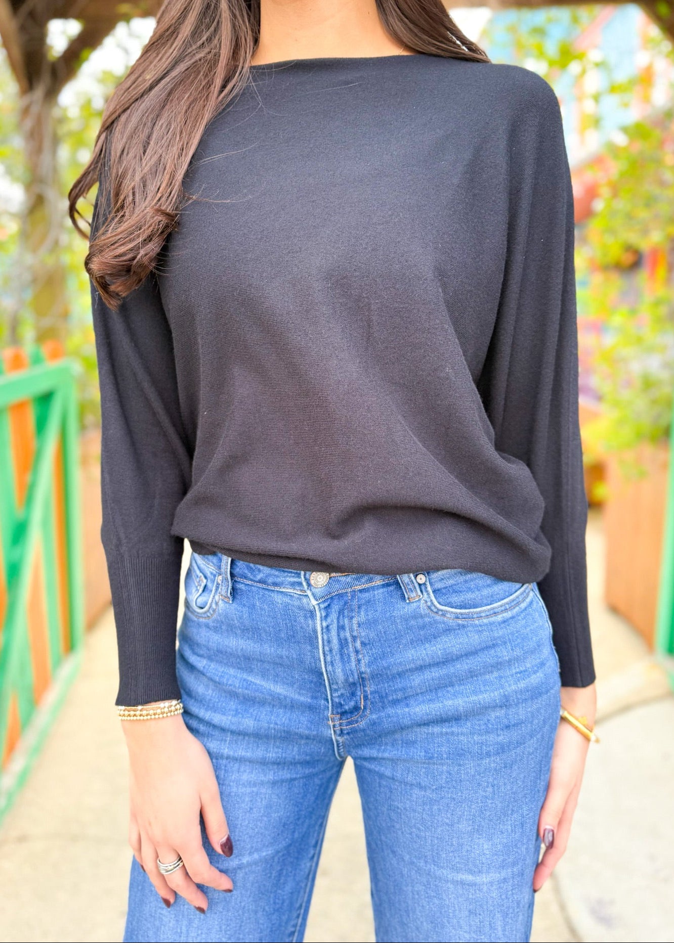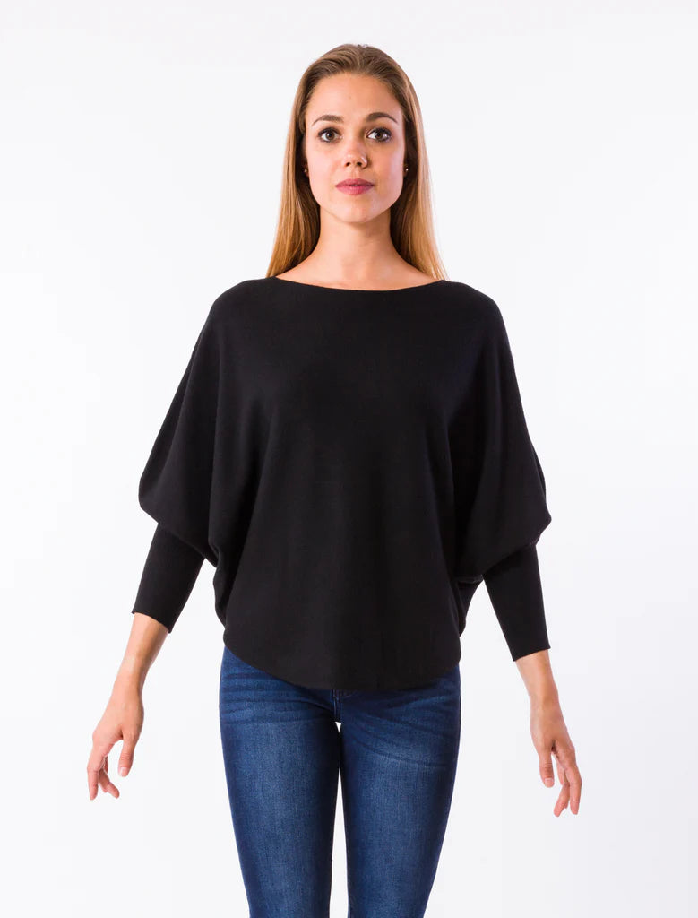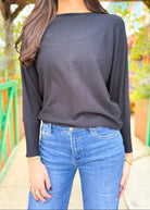 Boat neck top with 3/4 length dolman sleeves and curved sweep.