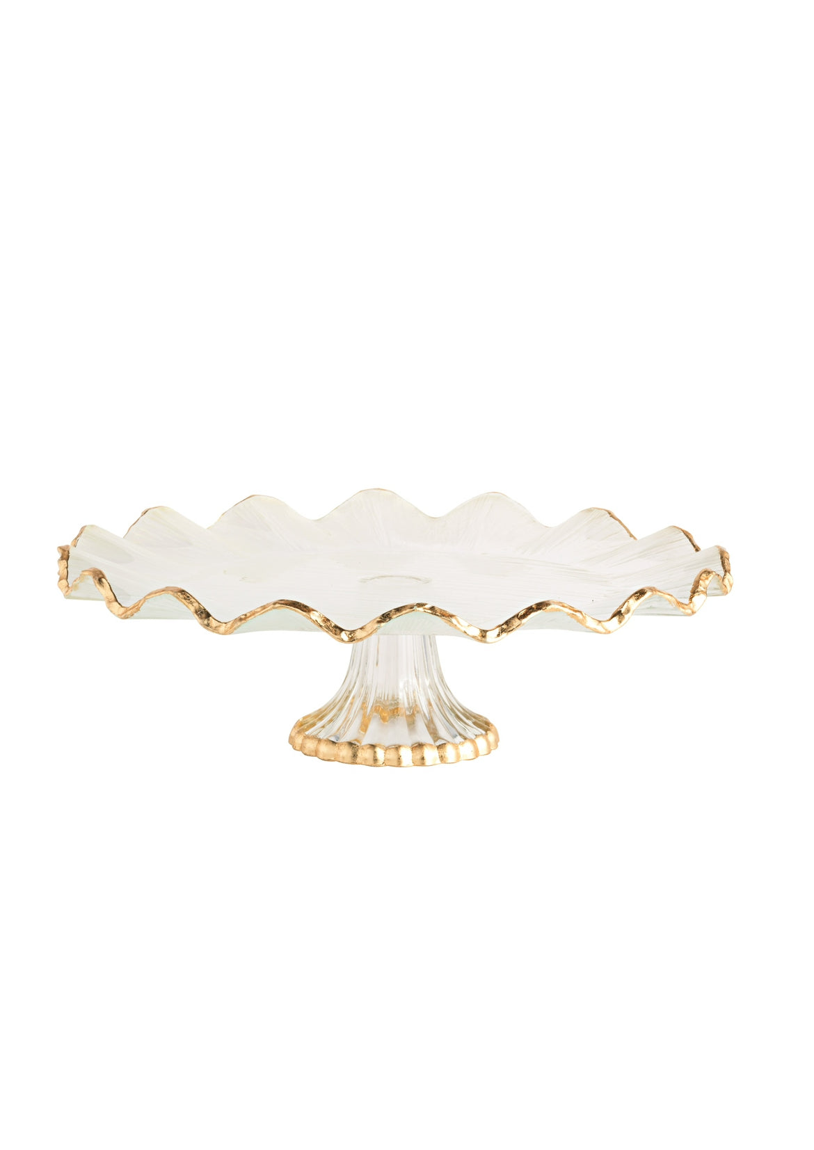 Glass cake stand with gold foil ruffle edge and pedestal.