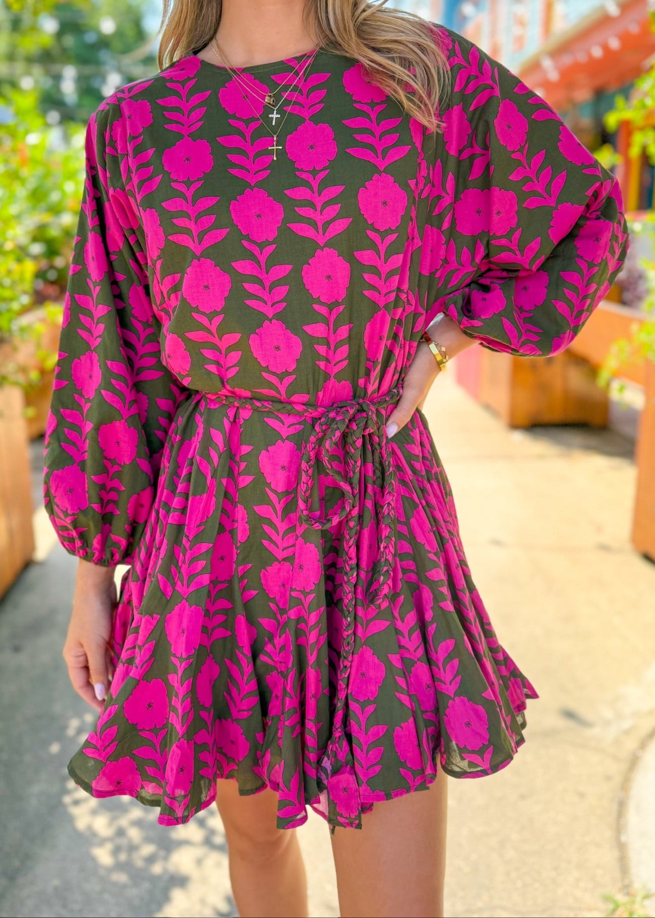 Embrace fall vibes with this olive and pink print dress, featuring long sleeves, a rope tie belt, and a flared skirt for a playful touch. With its scoop neckline and flattering silhouette, it’s the perfect piece for crisp afternoons and cozy autumn adventures!