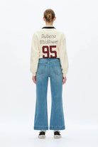 High rise wide leg denim jeans with a relaxed fit. Front panel features patch pockets, while the back panel incorporates tapered five-point back pockets. Subtle abrasions add character, with overall hand brush effect (marbling) but no whiskering. Finished with a wide leg opening for a balanced silhouette.