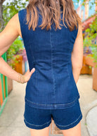 Denim vest featuring vintage buttons with a paperbag waste denim short.