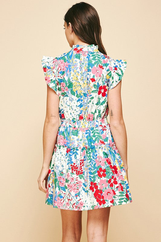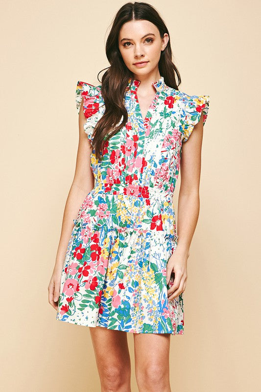 White Floral Vneck Poplin Mini Dress