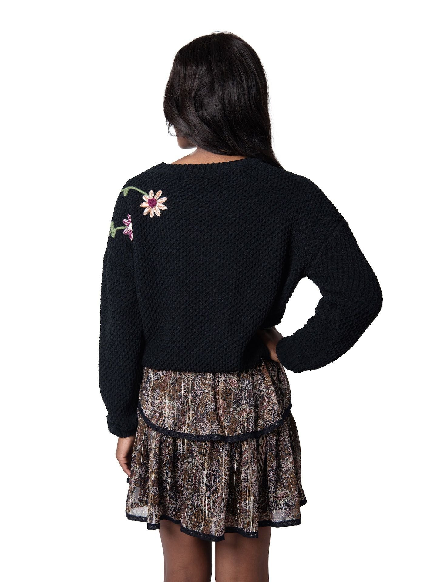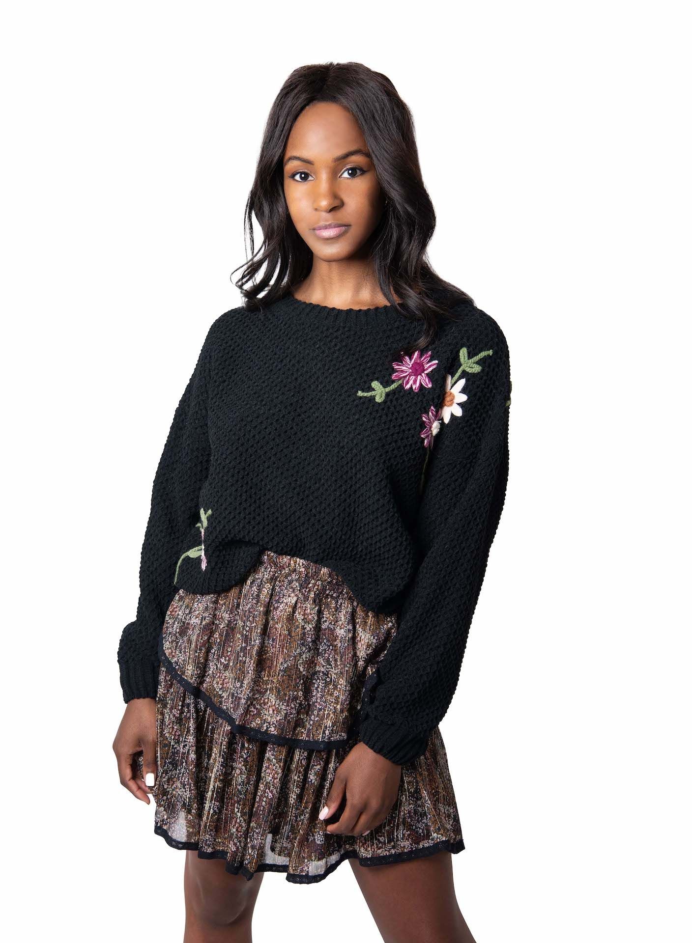 Black Embroidered Floral Chenille Sweater