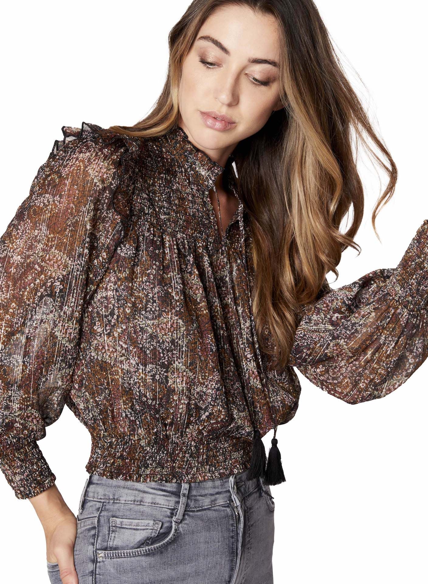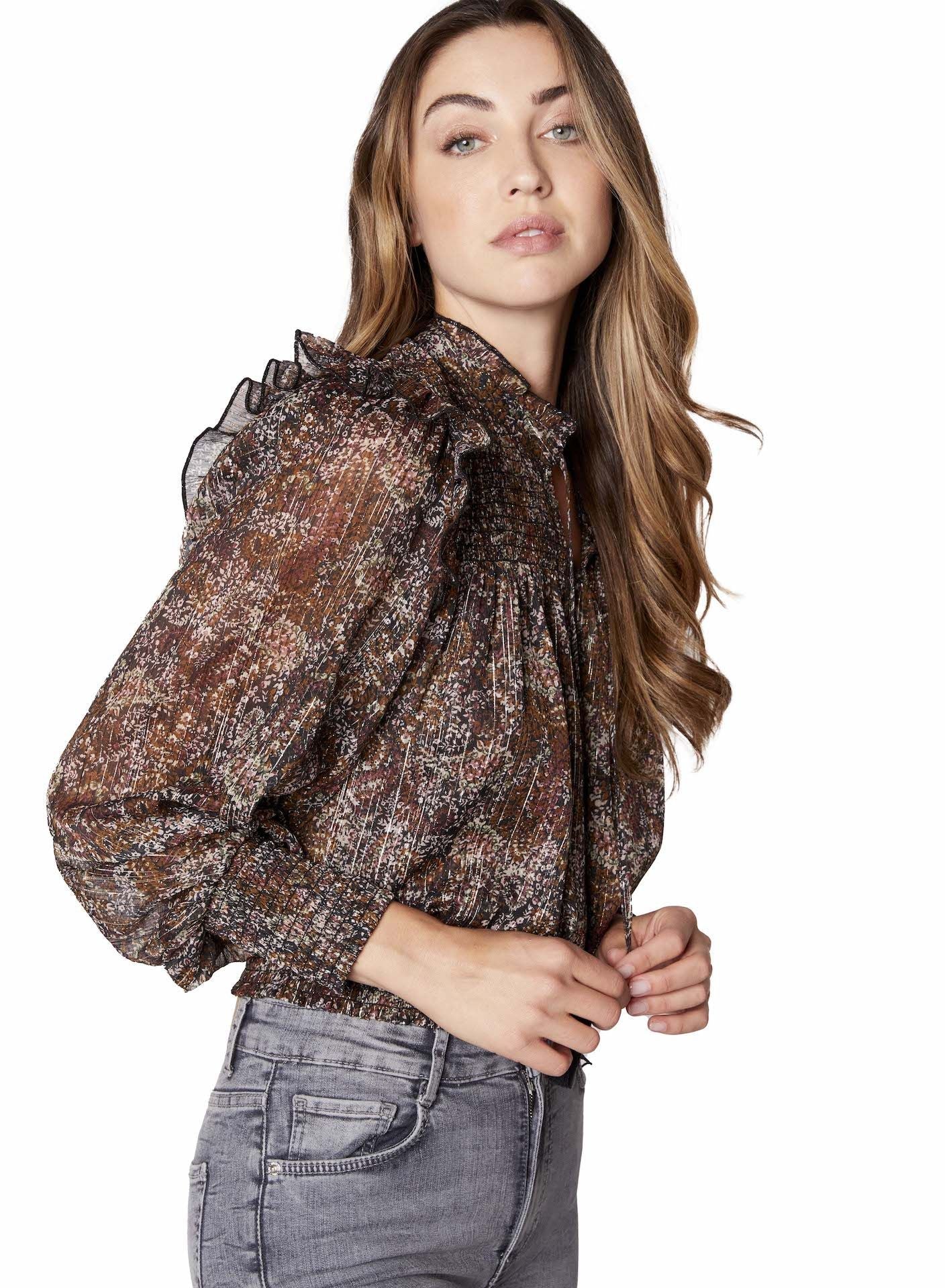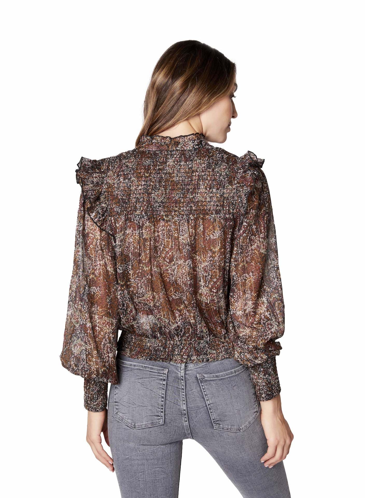 Brown Metallic Floral Smocked Ruffle Blouse