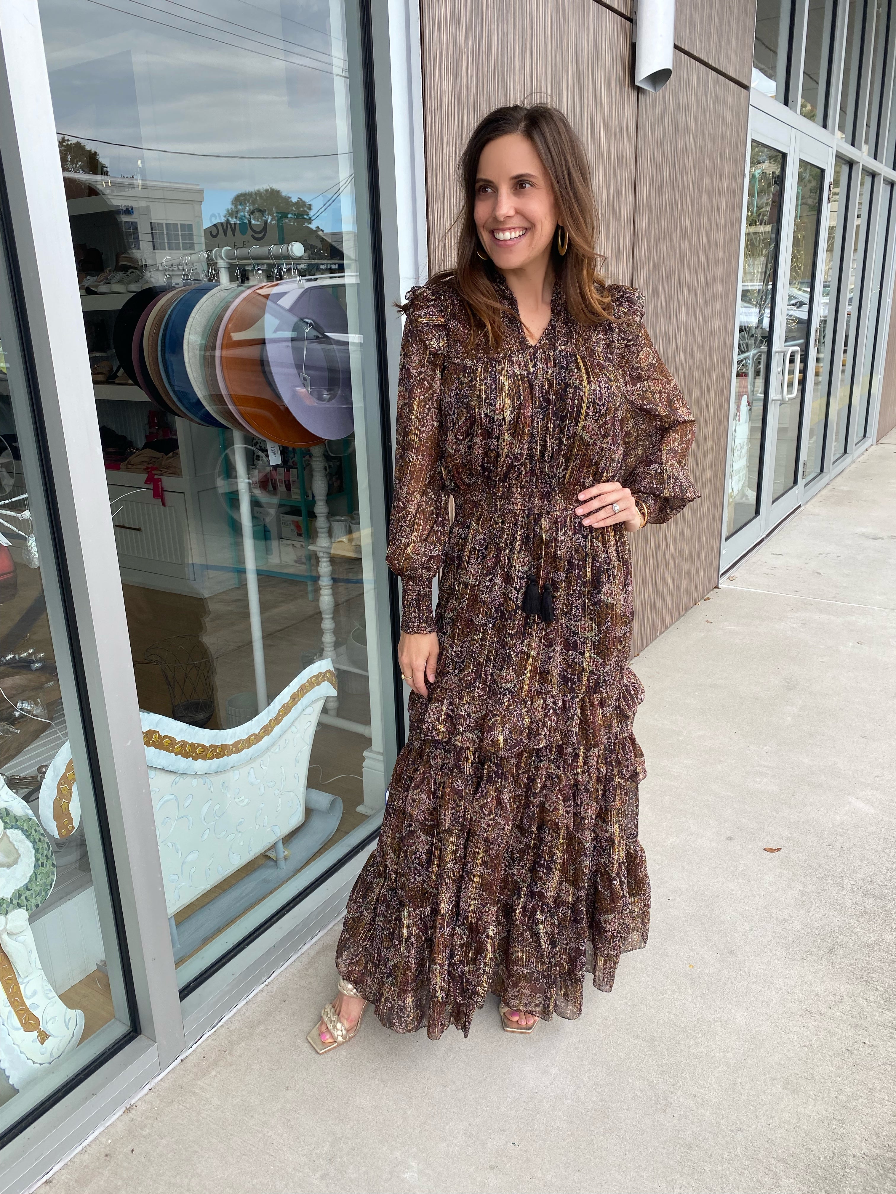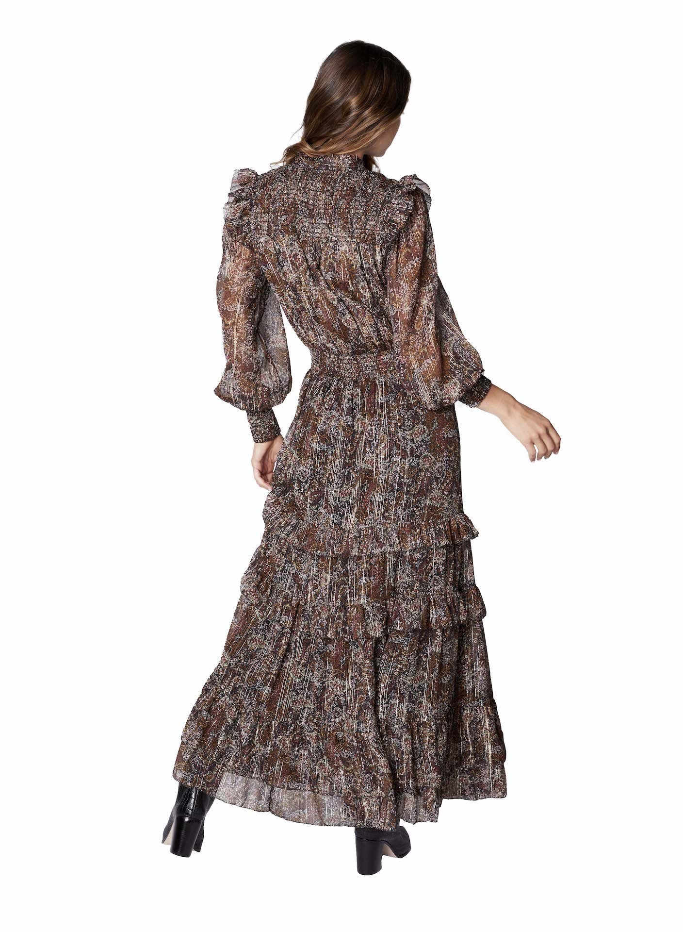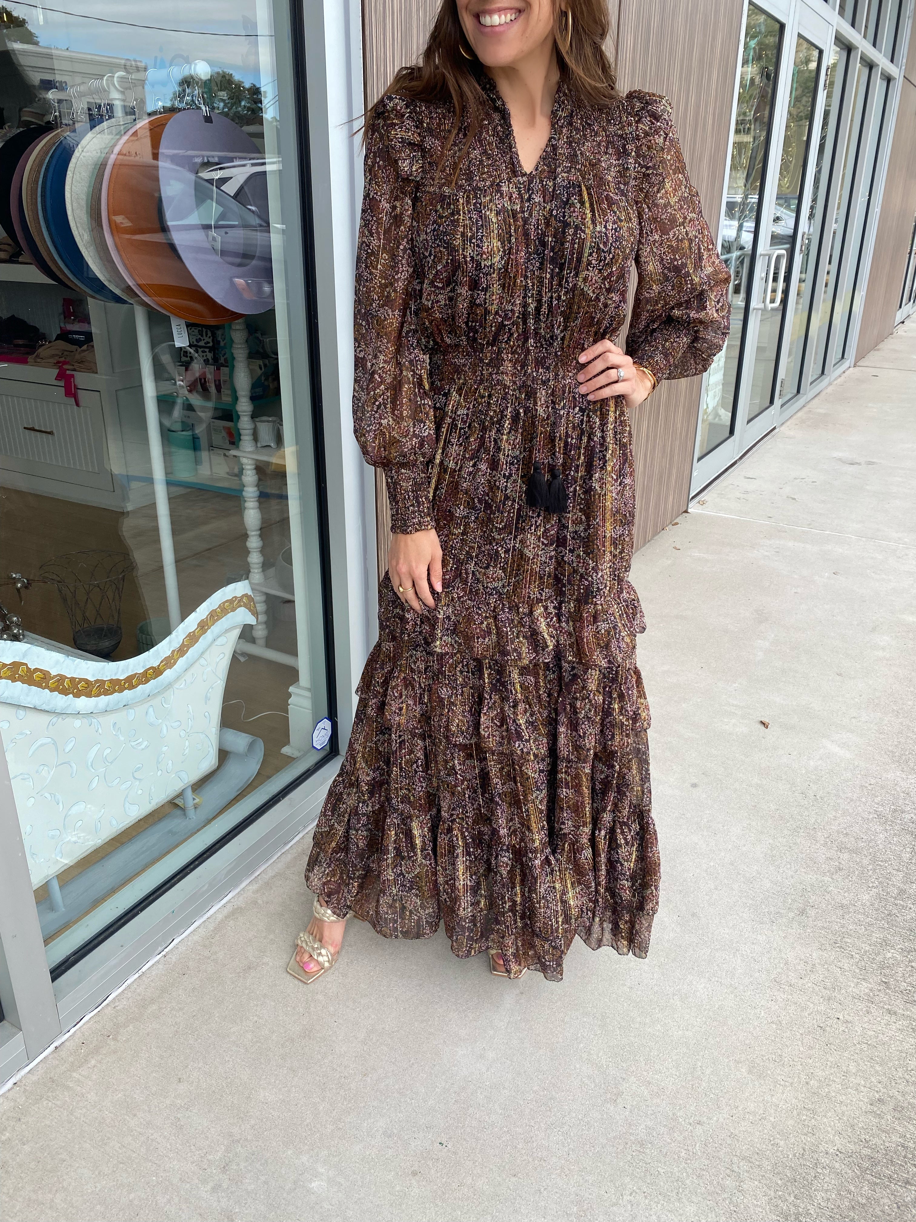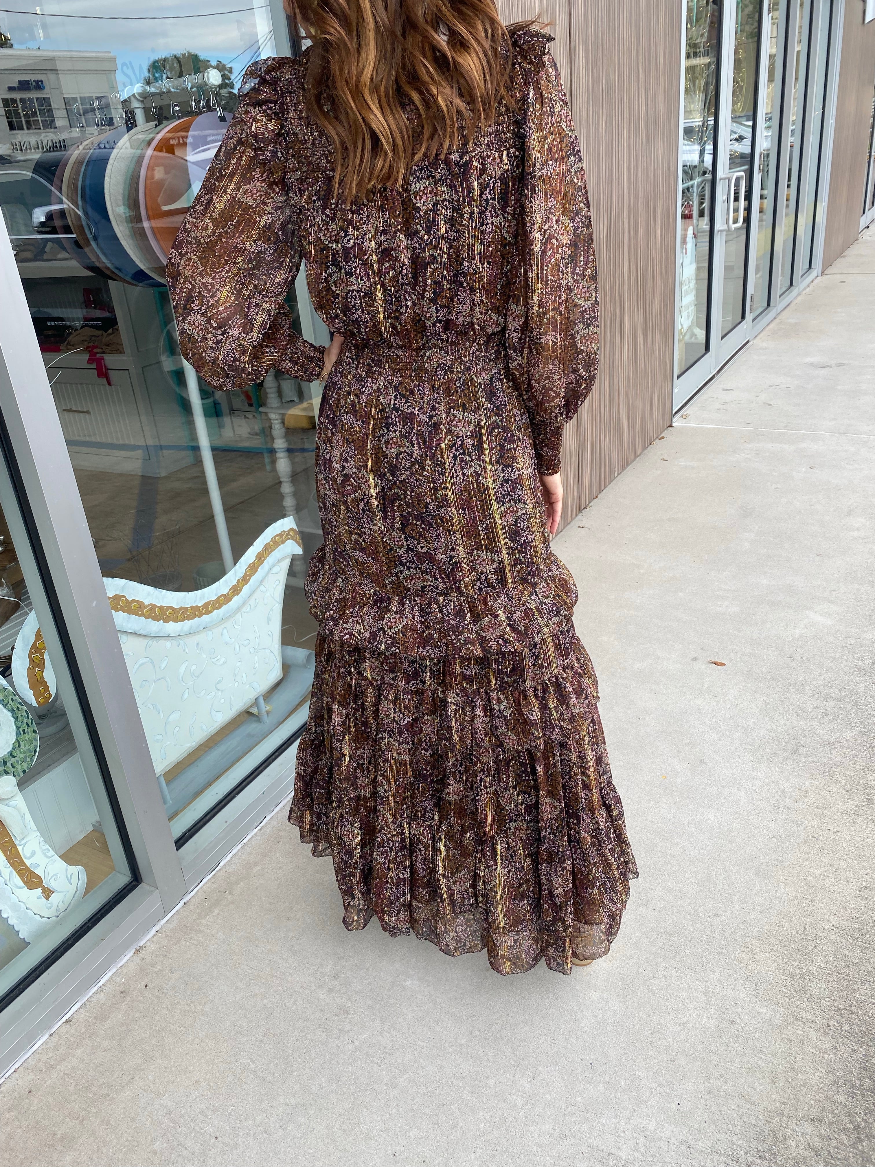 Brown Metallic Floral Smocked L/S Ruffle Dress