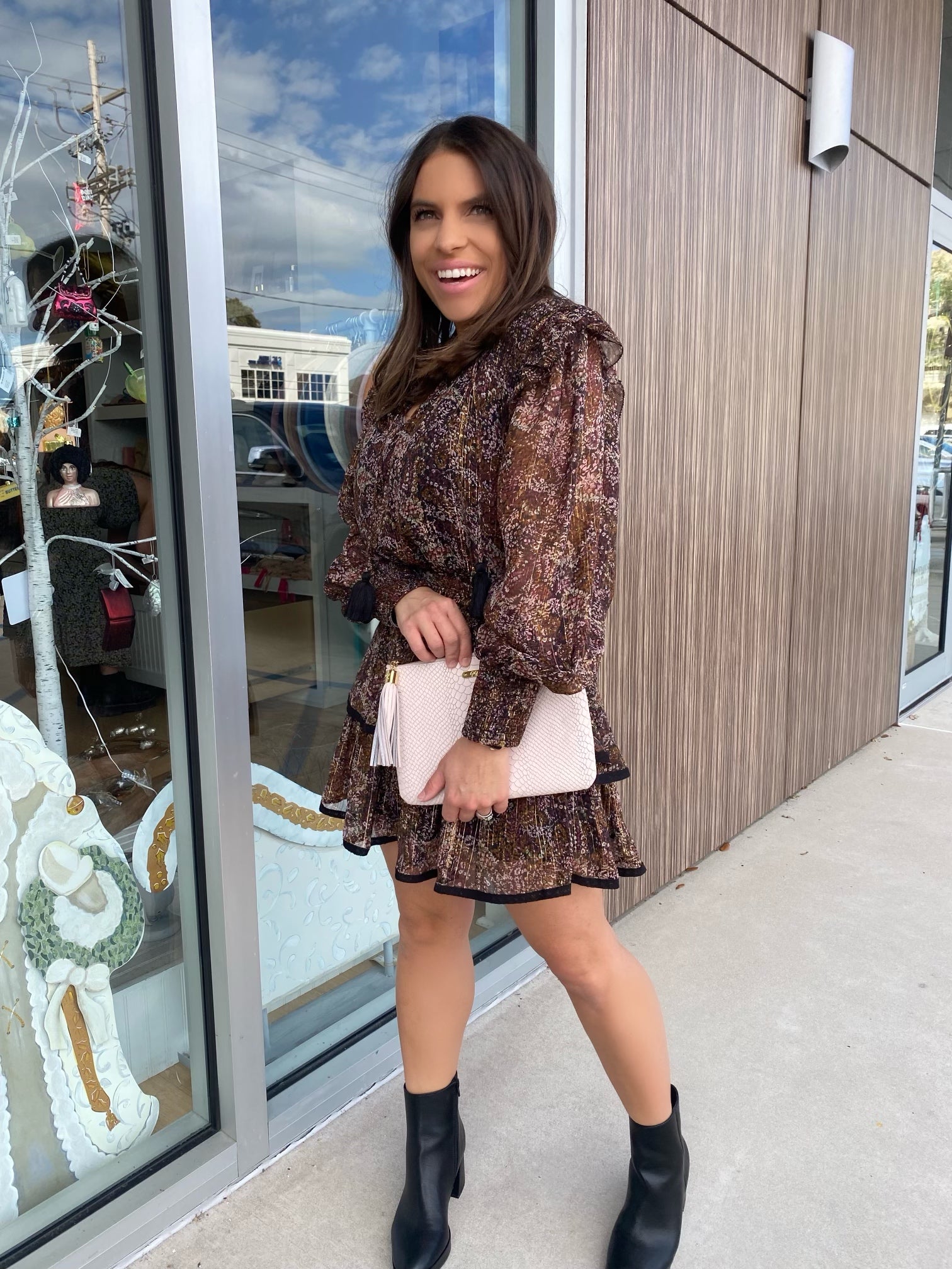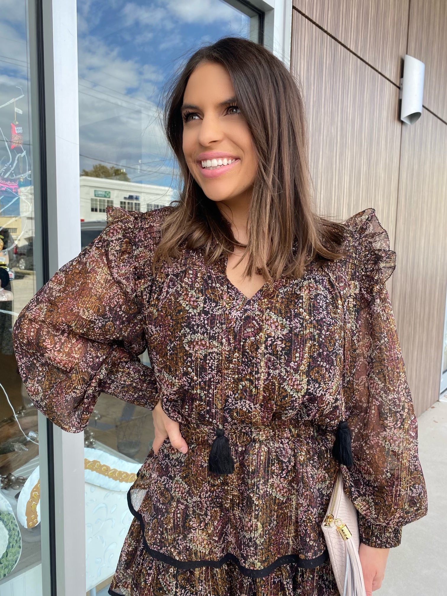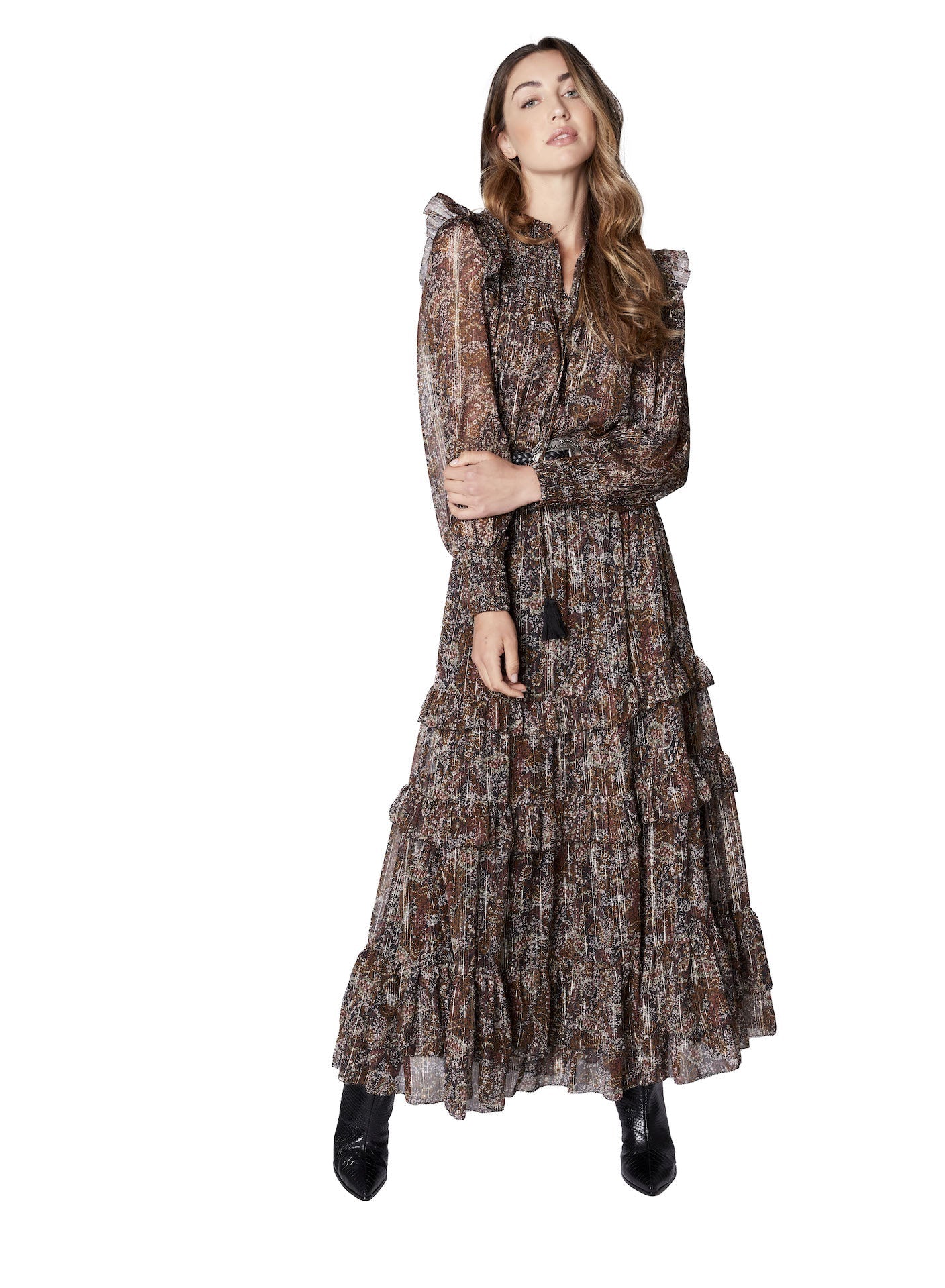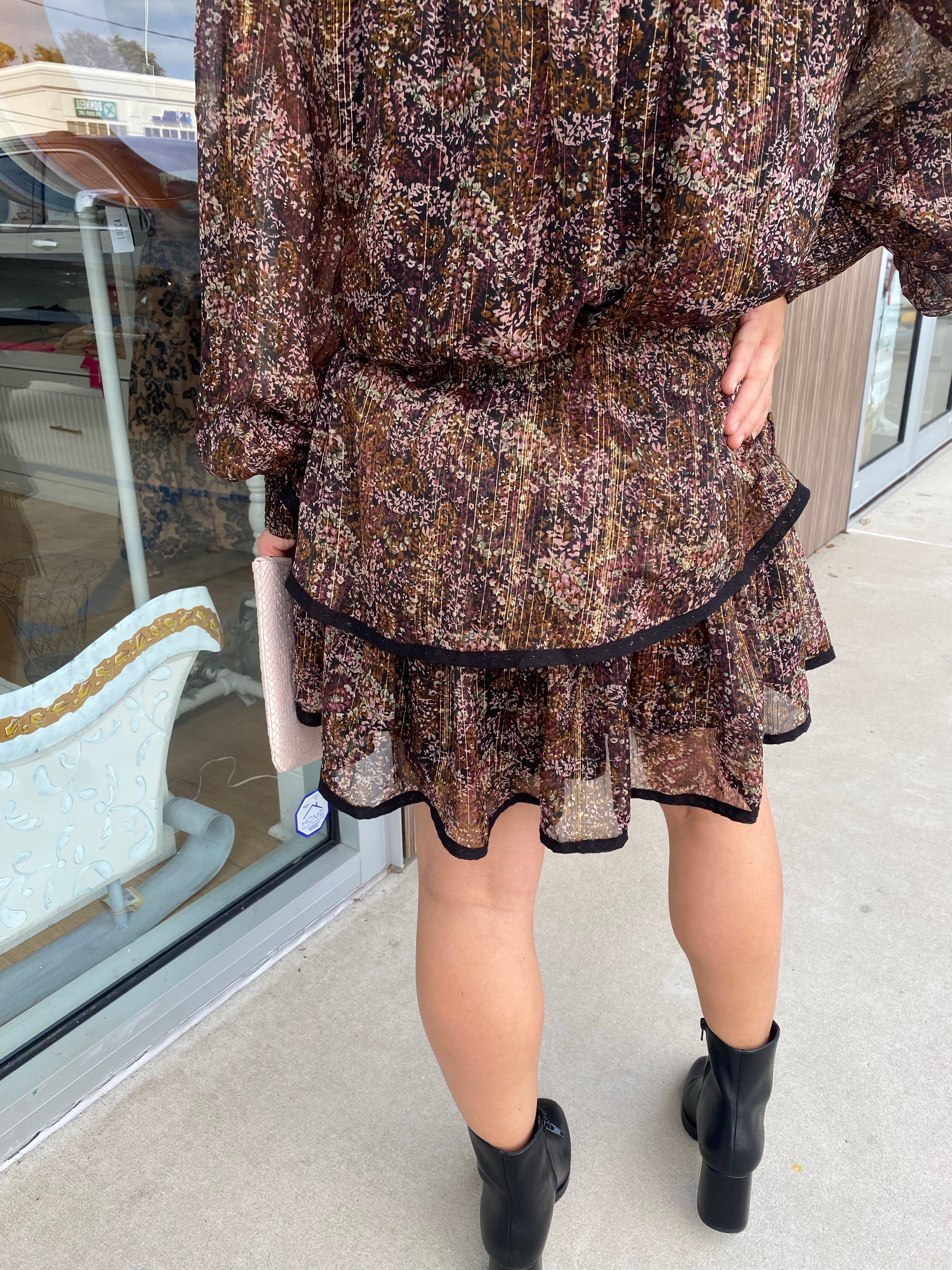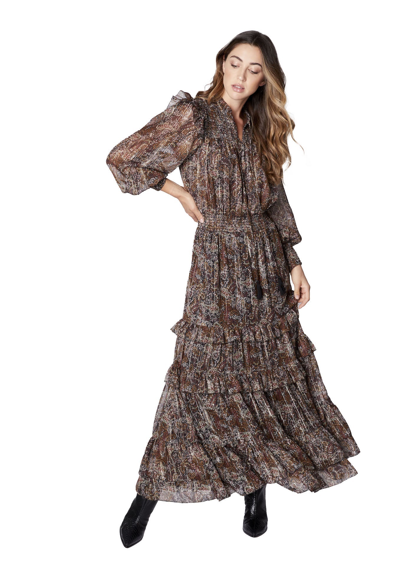 Brown Metallic Floral Smocked L/S Ruffle Dress