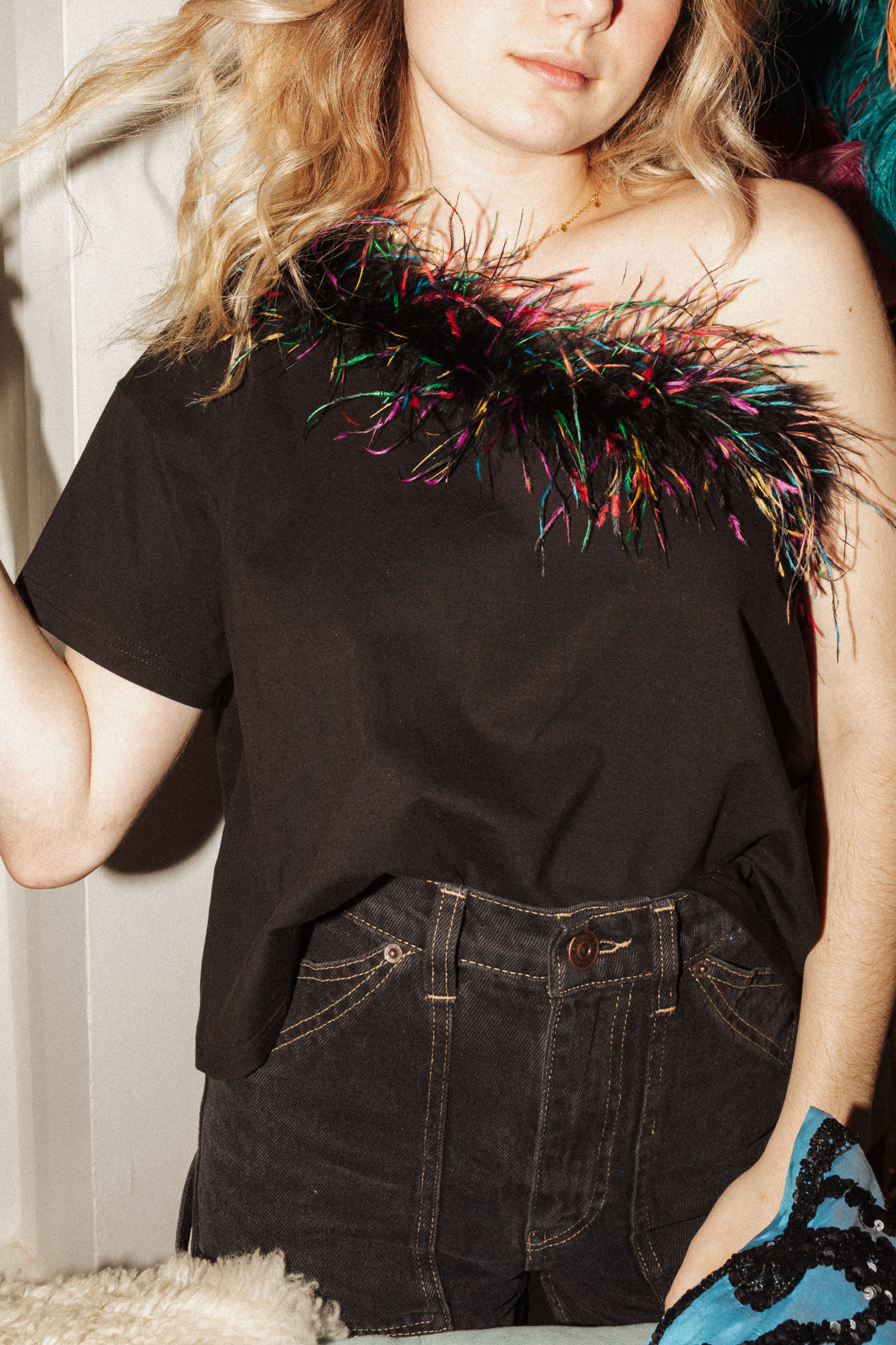 Black One Shldr Feather Tee