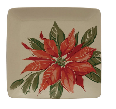 11" Square Stoneware Plate with Poinsettia, Red and Green