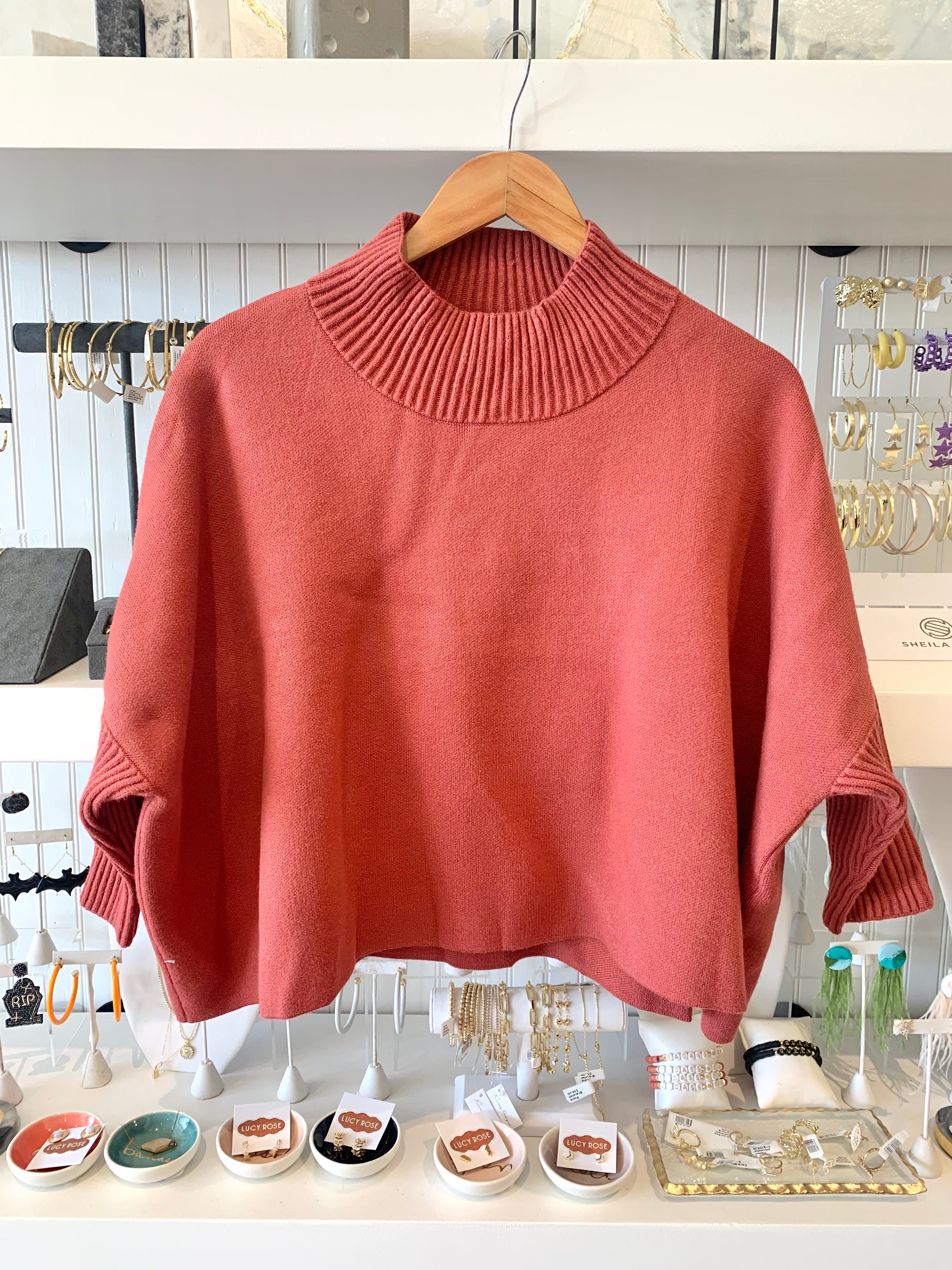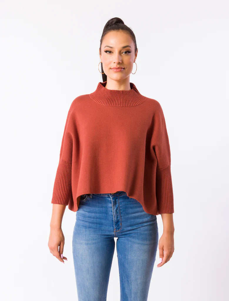 Oversized boxy sweater with fitted rib turtleneck & 3/4 sleeves
