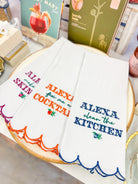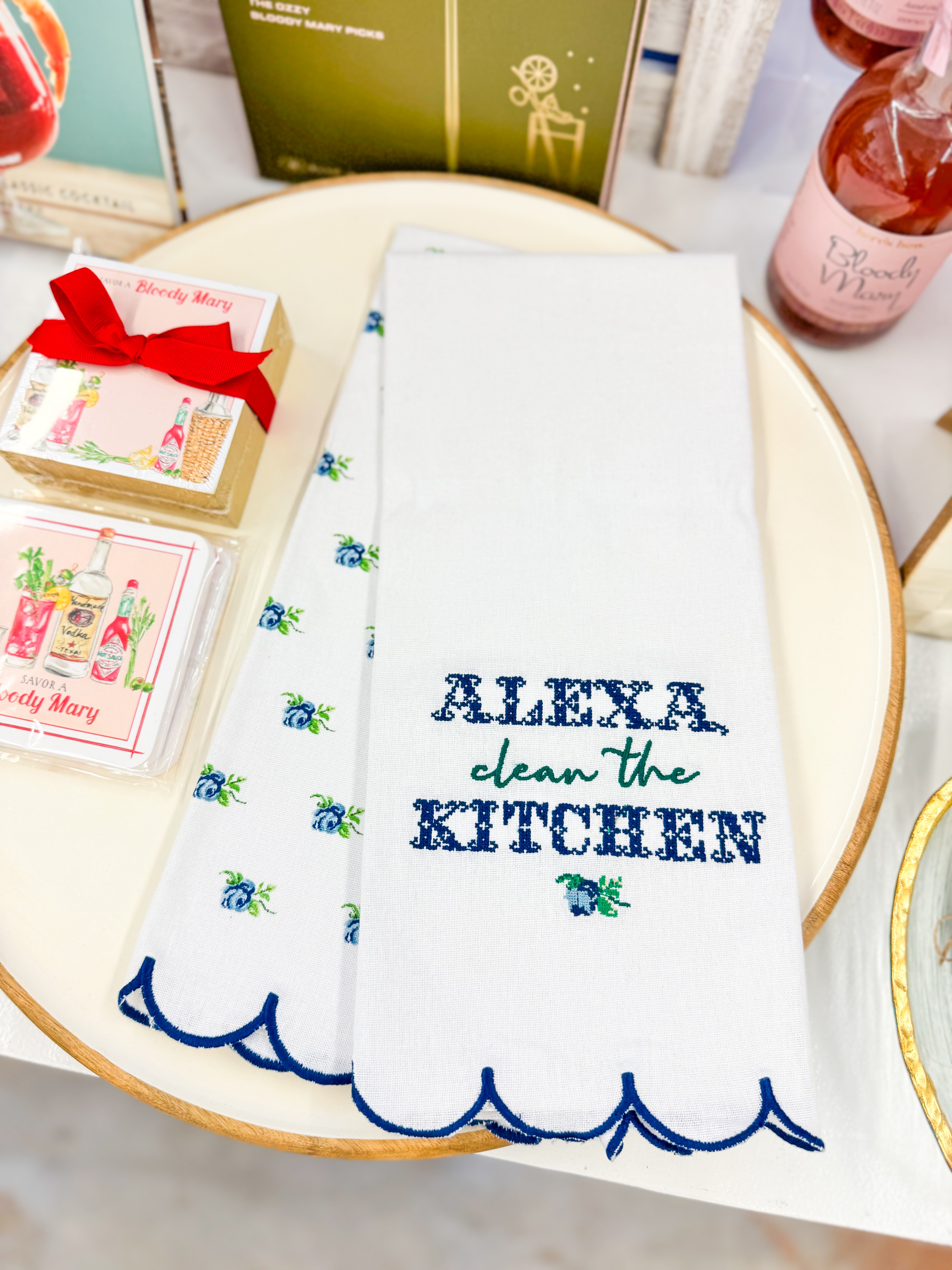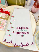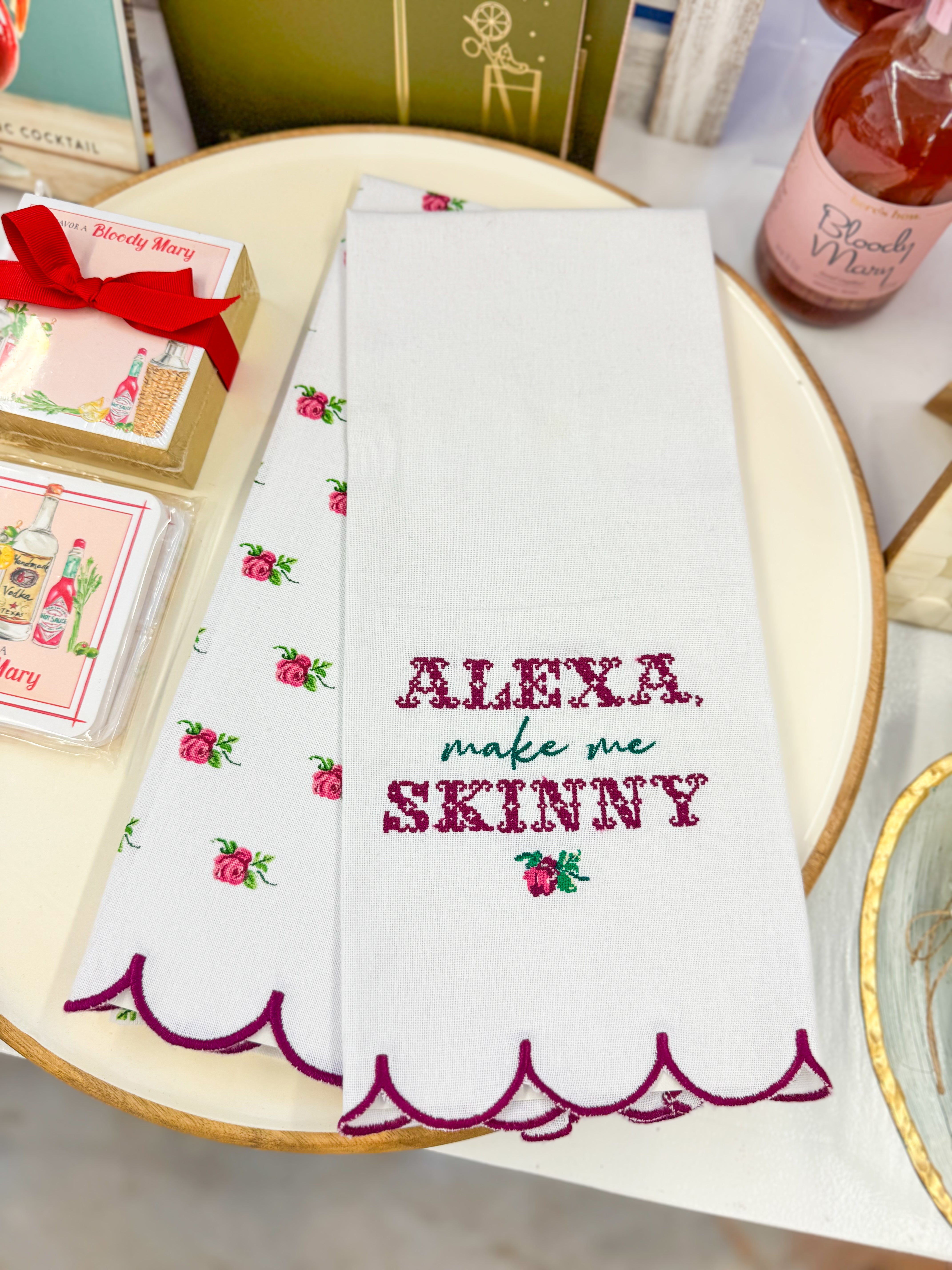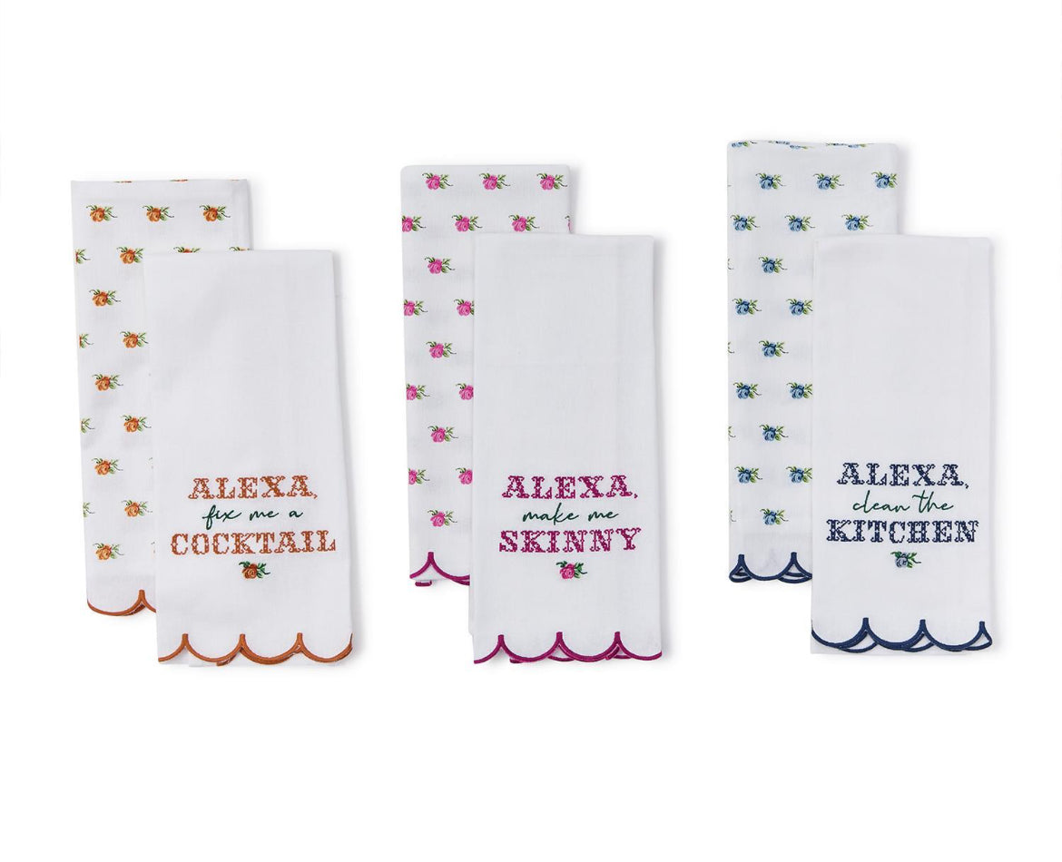 Alexa, are you listening? Alexa Kitchen Dish Towel designed by Boyar Gifts NYC feature three assorted designs and sayings: "Make Me Skinny," "Fix Me a Cocktail," and "Clean the Kitchen." Perfect for adding a touch of whimsy to your culinary space, these towels are both functional and stylish. Ideal for drying dishes, hands, or simply hanging on display, these versatile accessories are a must-have for any home chef.