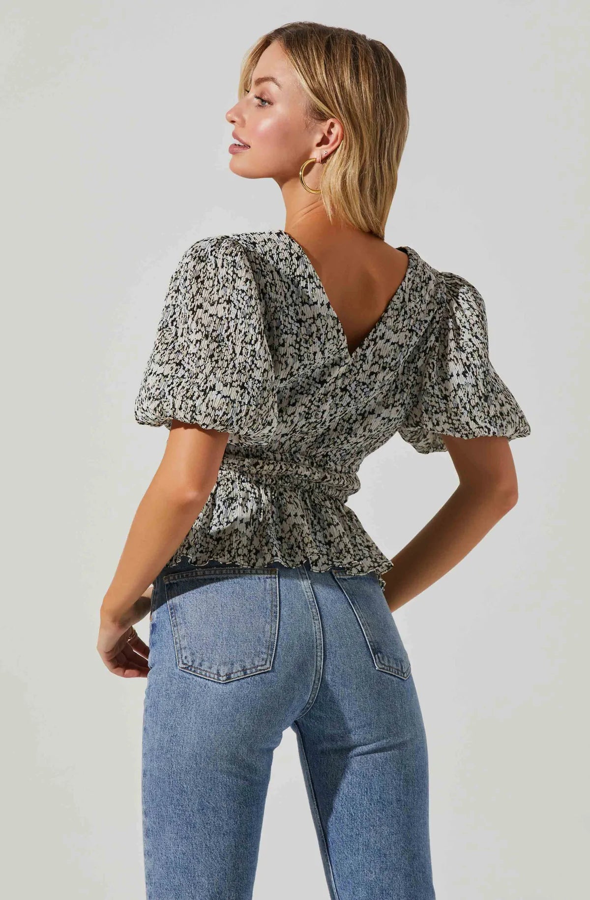 The Alexis Top features a ditsy floral print throughout. Plunging V neckline leads to a ruched bodice with drawstring accents at the front. Peplum hem. V cut back. Short, puff sleeves.