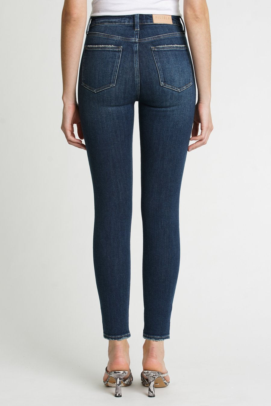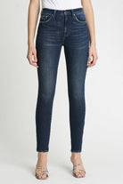 This must-have leg-lengthening skinny comes in a dark blue wash and features subtle distressing at the hem.