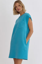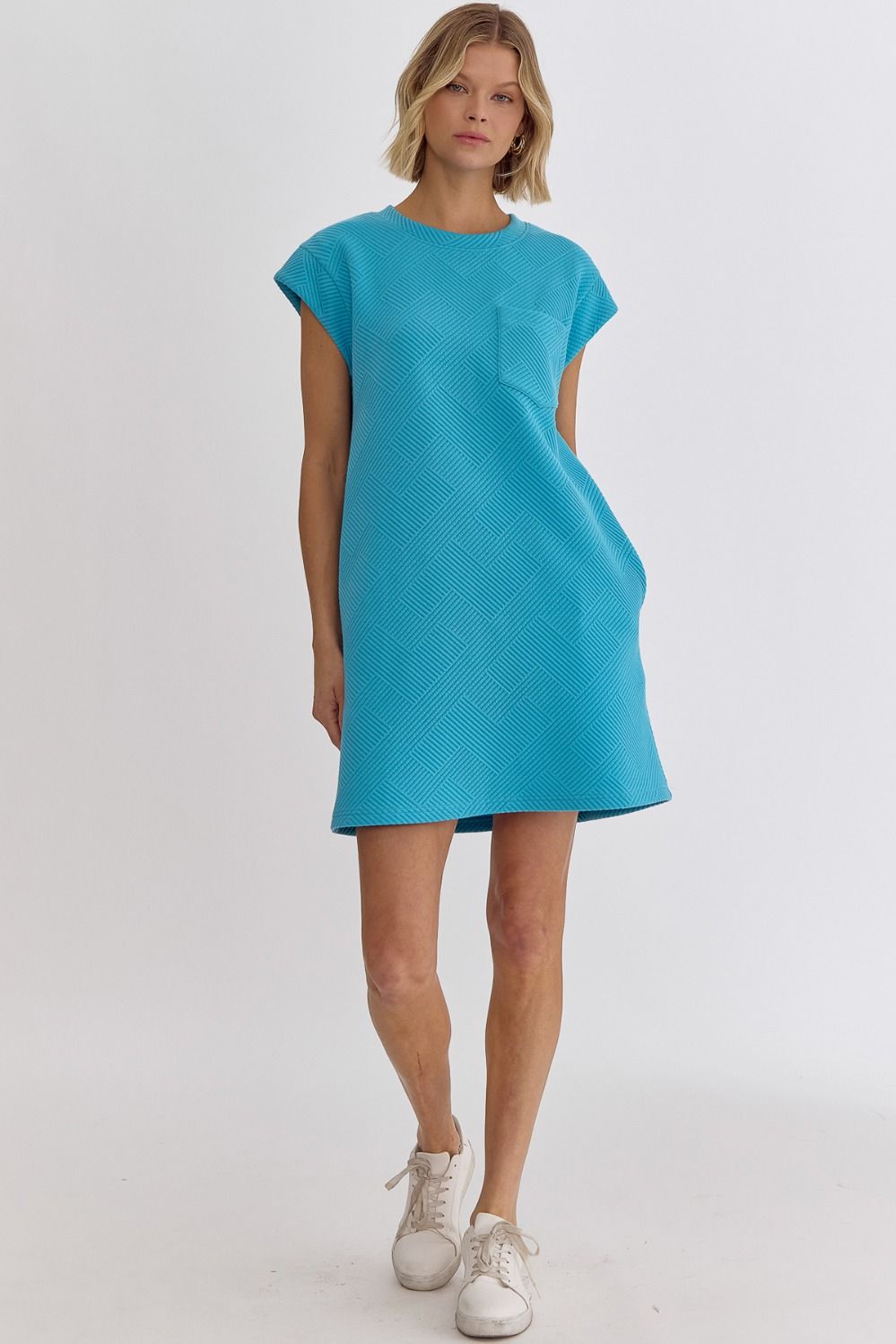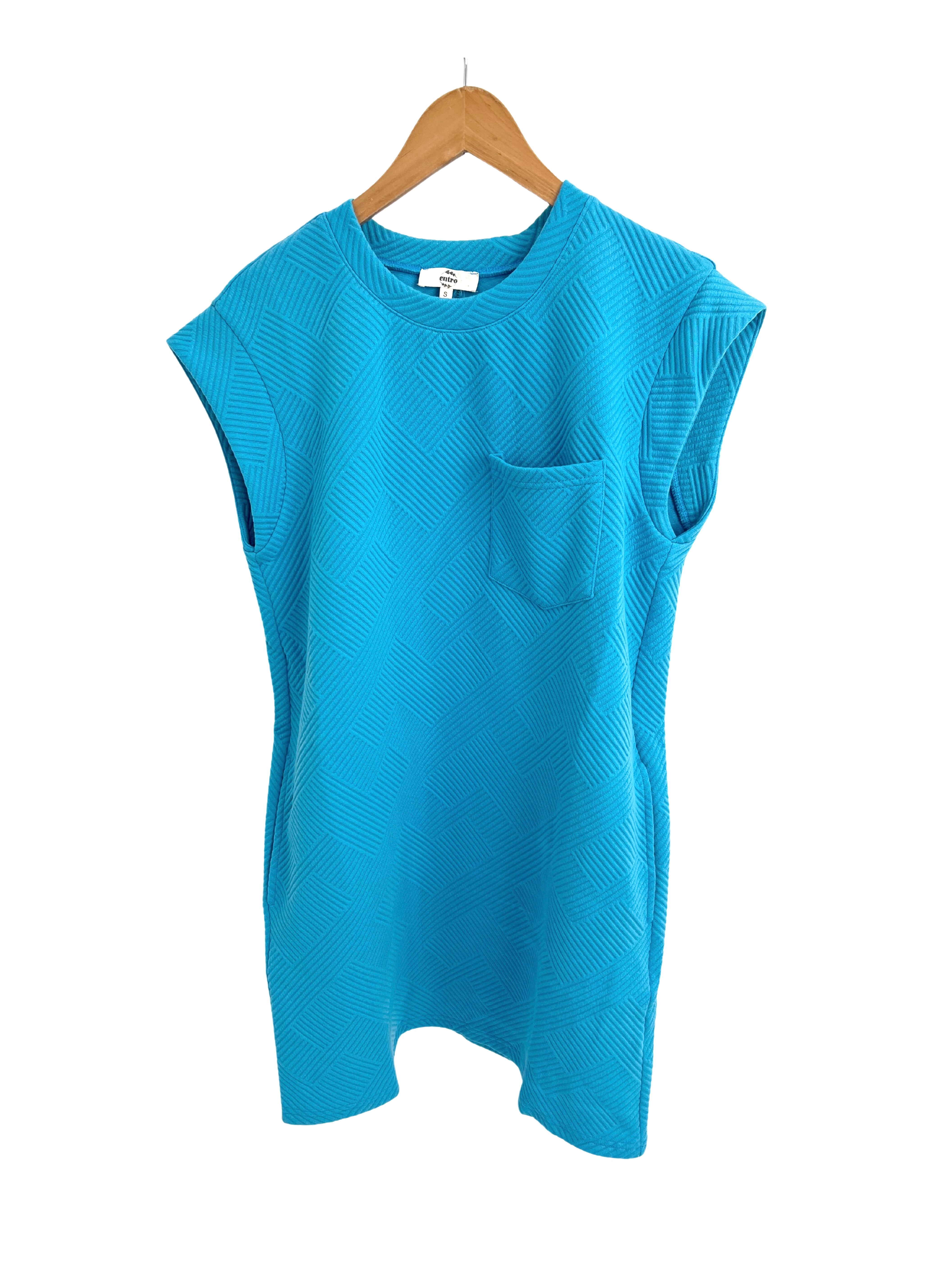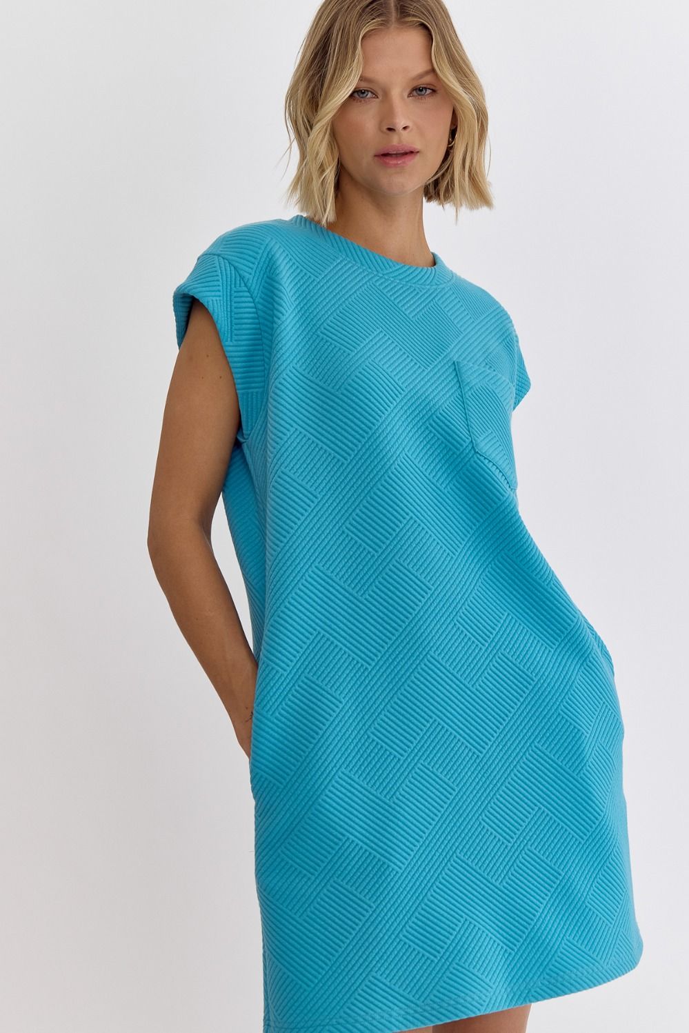 Textured round neck sleeveless mini dress featuring single pocket at bust. Pockets at side. Unlined. Knit. Non-sheer. Lightweight.