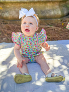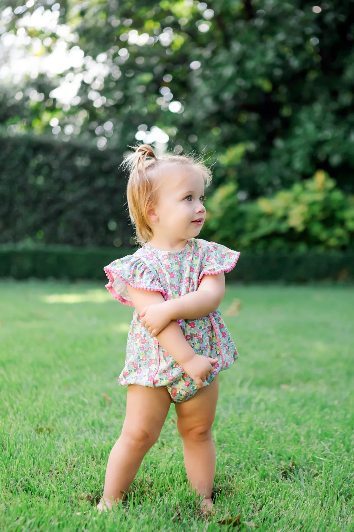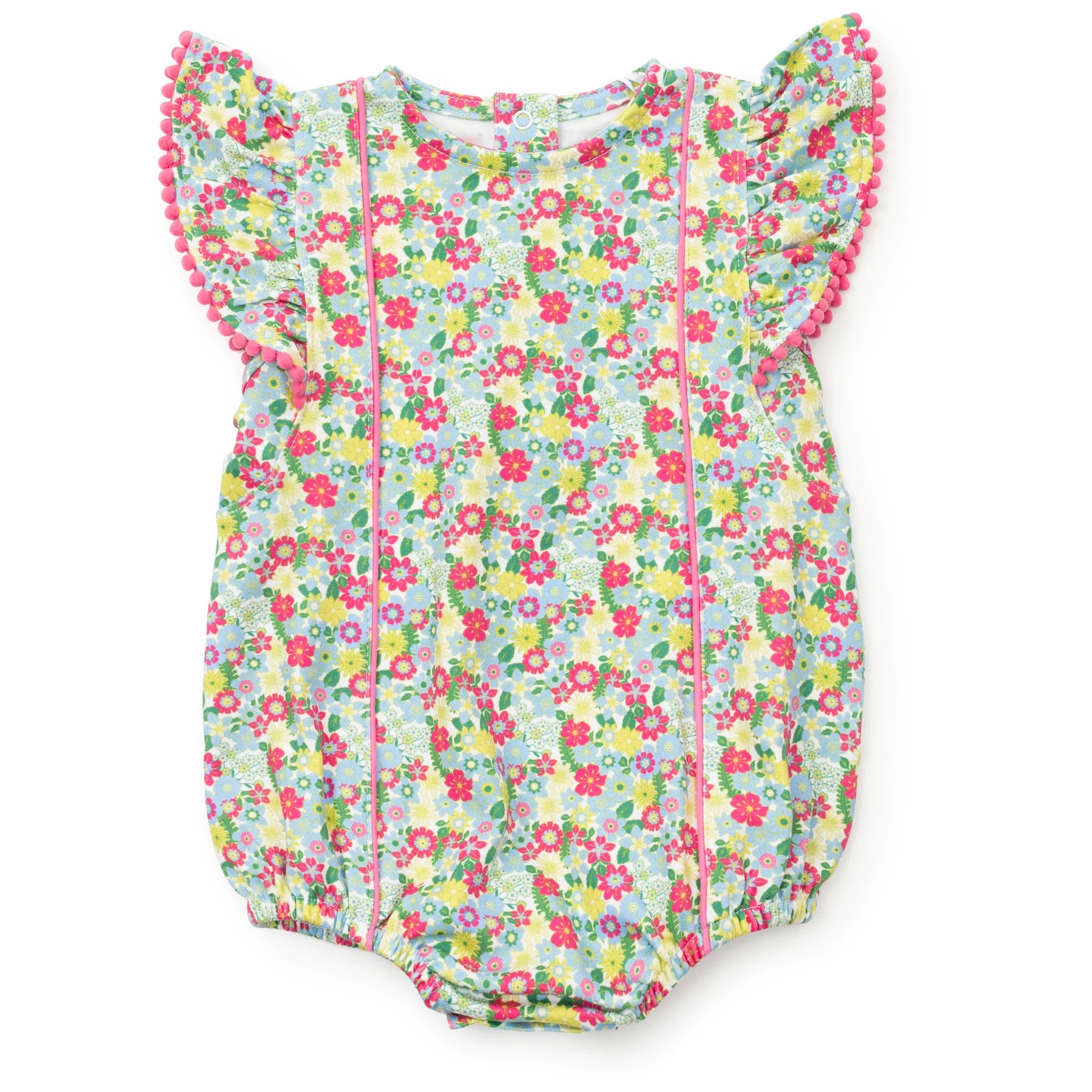 GIRLS' PIMA OVERSIZED FLUTTER SLEEVE BUBBLE WITH POM POM TRIM AND CONTRASTING PIPING. BUTTON CLOSURE IN THE BACK.