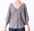 Oversized V-neck top w/ 3/4 length dolman sleeves and curved sweep in horizontal rib pattern