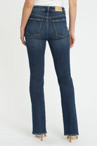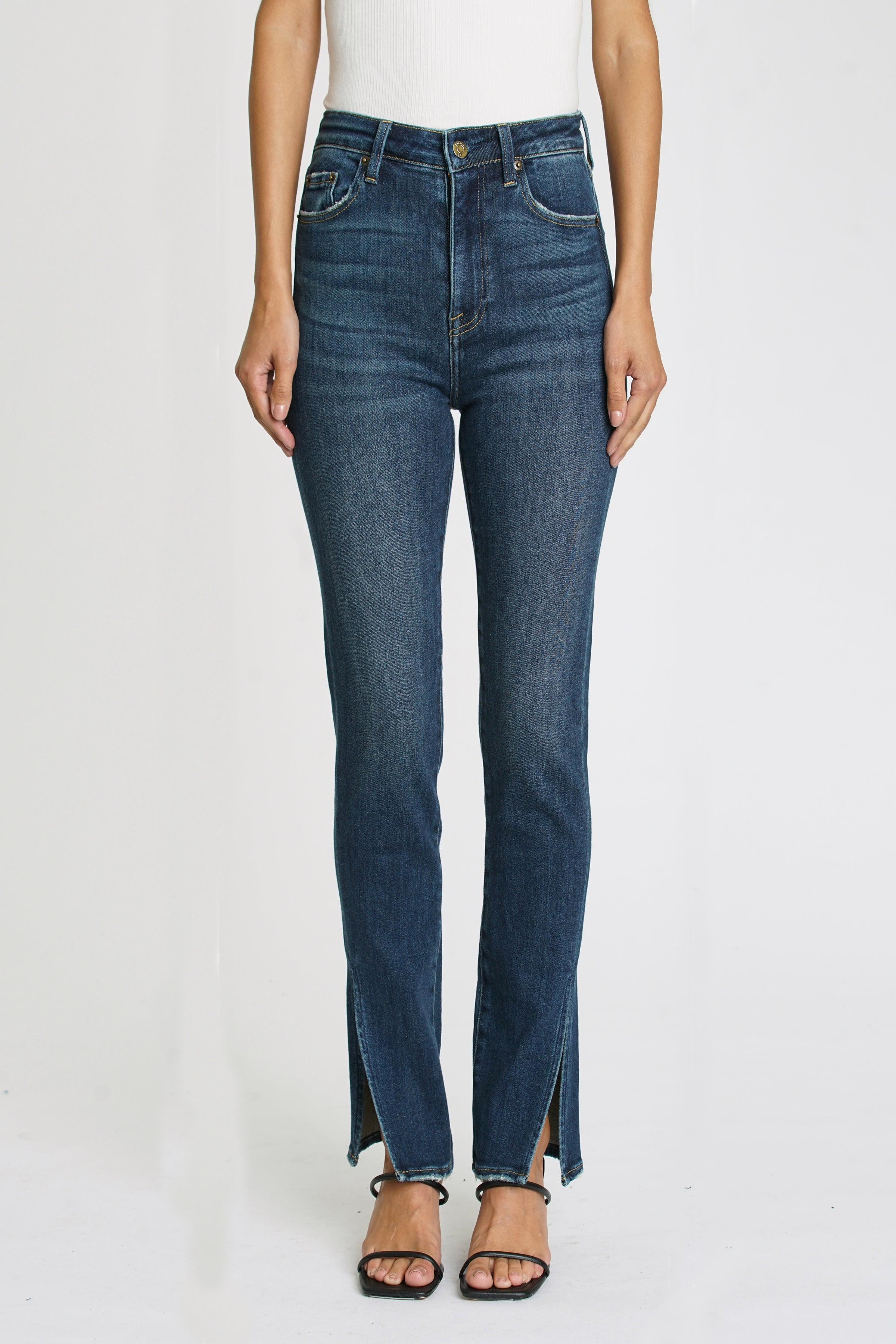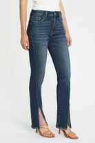 This style comes in a medium wash denim with a metal button closure, a zip fly, and contrast stitching. The Teagan has a chic slit detail at each ankle — the perfect complement to a statement shoe.