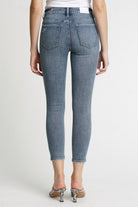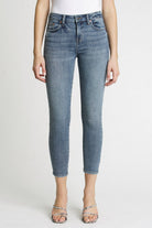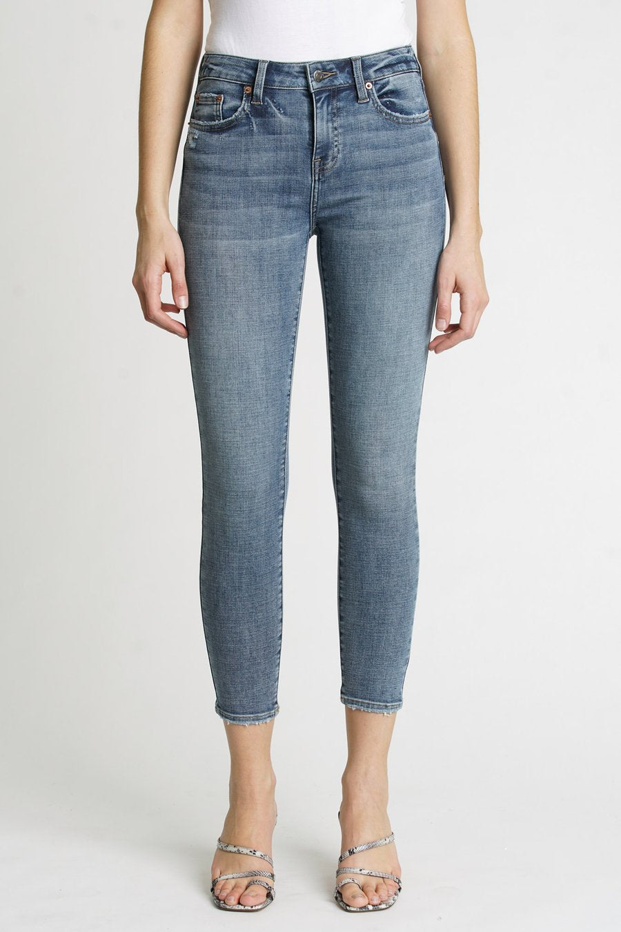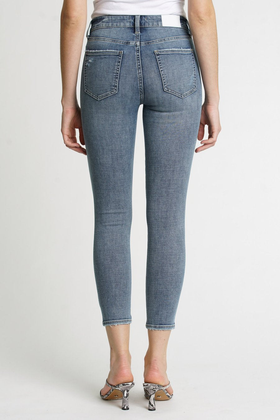 This second-skin style comes in a vintage inspired medium wash with frayed hems.