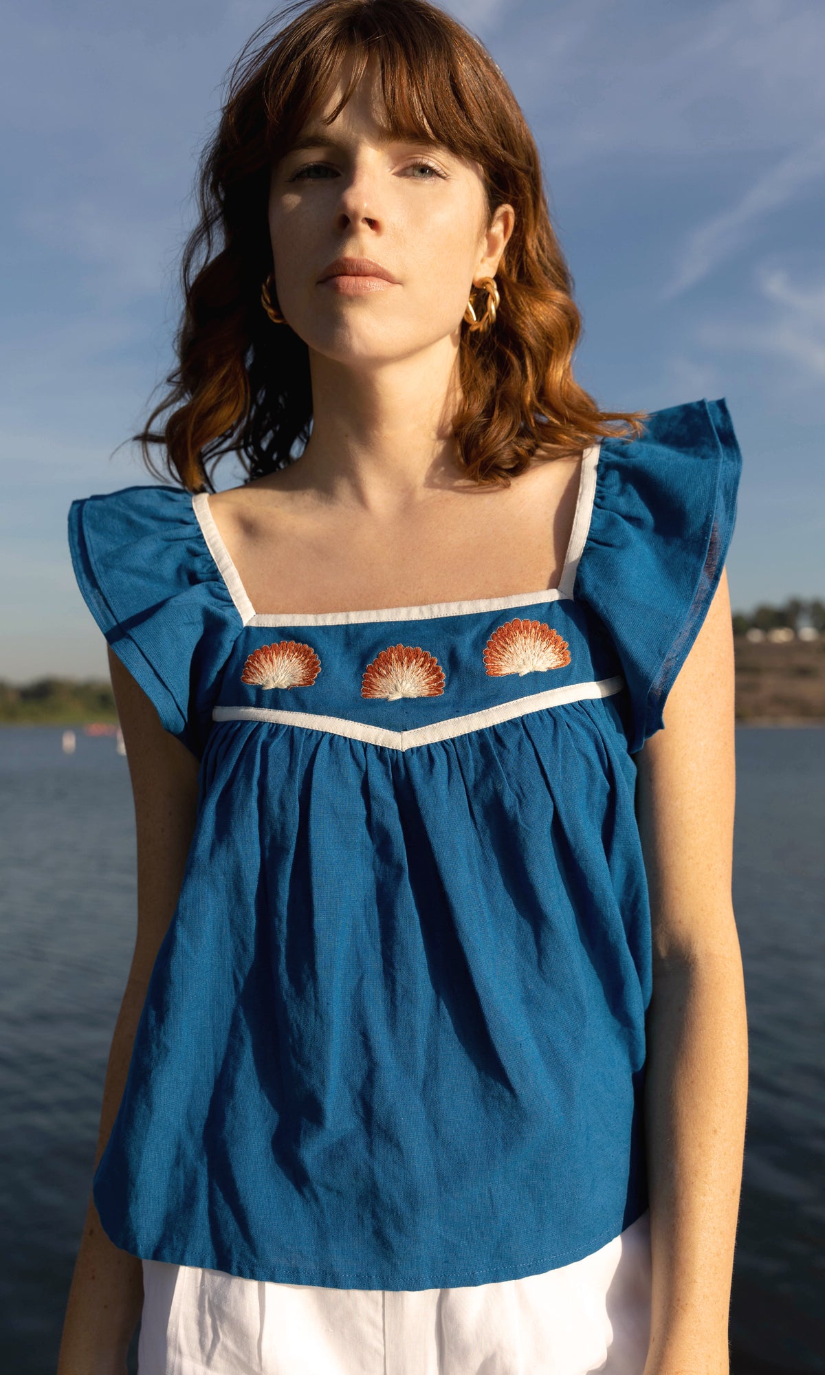 We love the blue hue of this breezy linen-blend blouse. Done in a relaxed and flowy fit this blouse features double ruffled sleeves, seashell embroidery details, contrasting binding along the yoke seam, and is finished with small button placket along back.