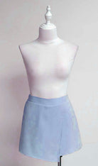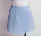 A woven skort featuring an asymmetrical overlay hem and an elasticized waistband on the back.