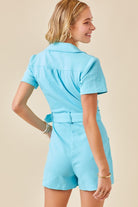 ZIP FRONT BELTED DENIM ROMPER MODEL IS WEARING A SIZE SMALL / HEIGHT: 5'8"
