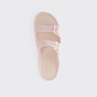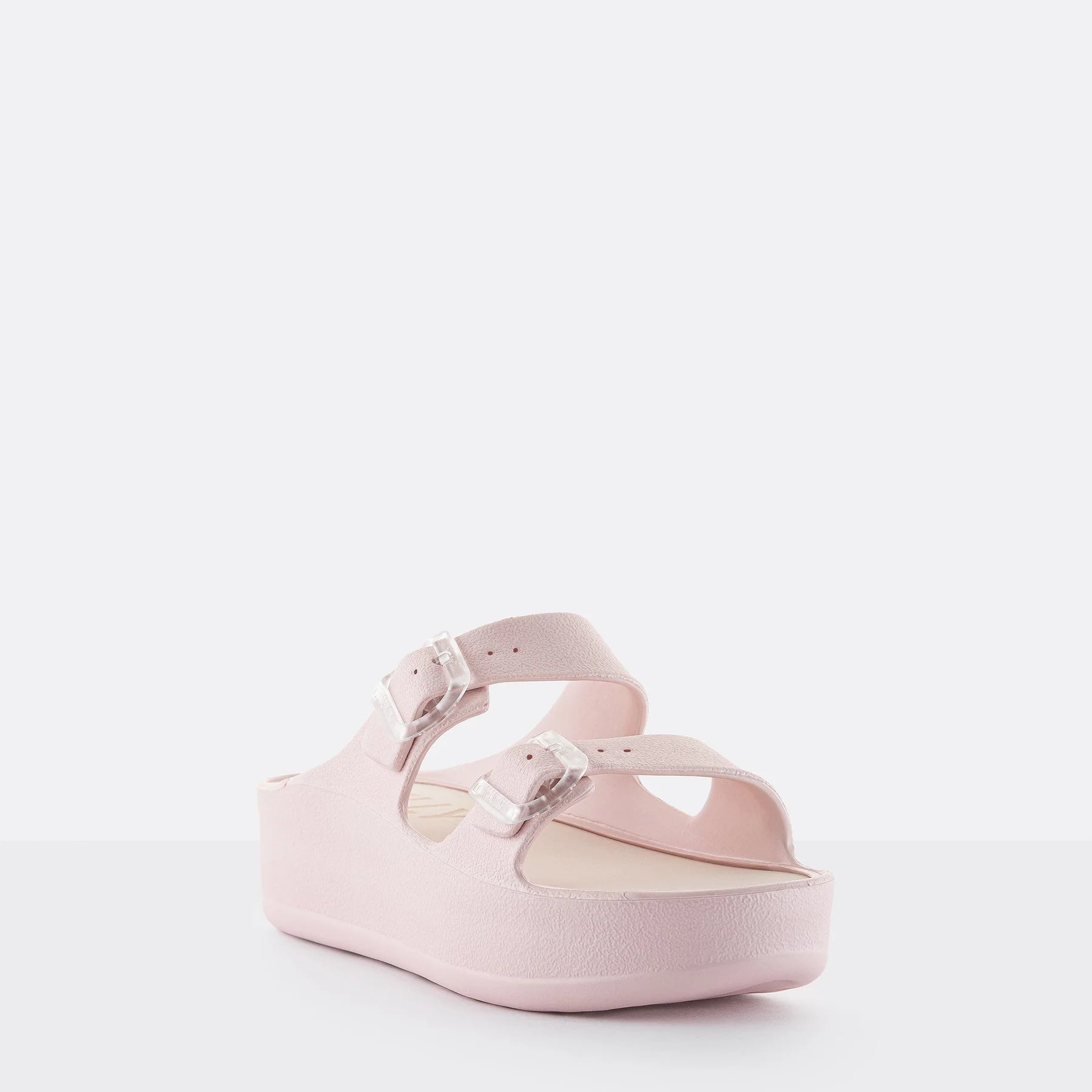 The classic double buckle sandals style is back to the season trends. In a neutral and discreet baby rose shade that goes well with other colour combinations and textures and a 5cm platform heel, these sandals with buckles create sweet moments and loving looks for all your spring and summer adventures. Produced in Portugal, with a vegan stamp and a cushioned insole that ensures all-day comfort.