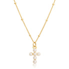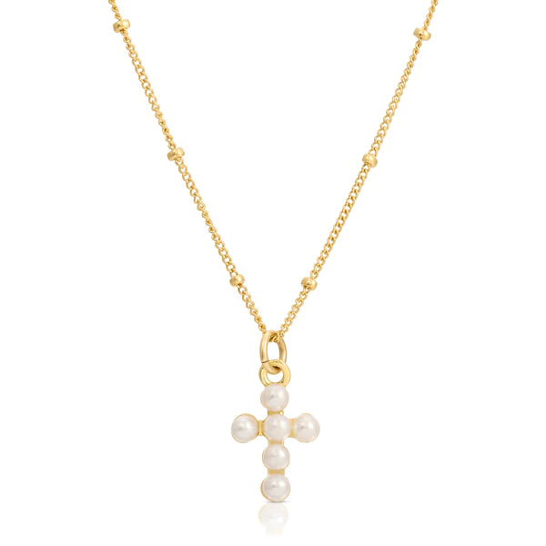 This Baby Vivi Charm Necklace is a mini version of our best selling Vivian Cross Necklace, using pearls to create the cross hanging from our dainty 14k Gold-filled chain which keeps it cute and light. The perfect soft summer necklace, able to stand alone and keep it simple, or stack with our other beautiful pearl styles.