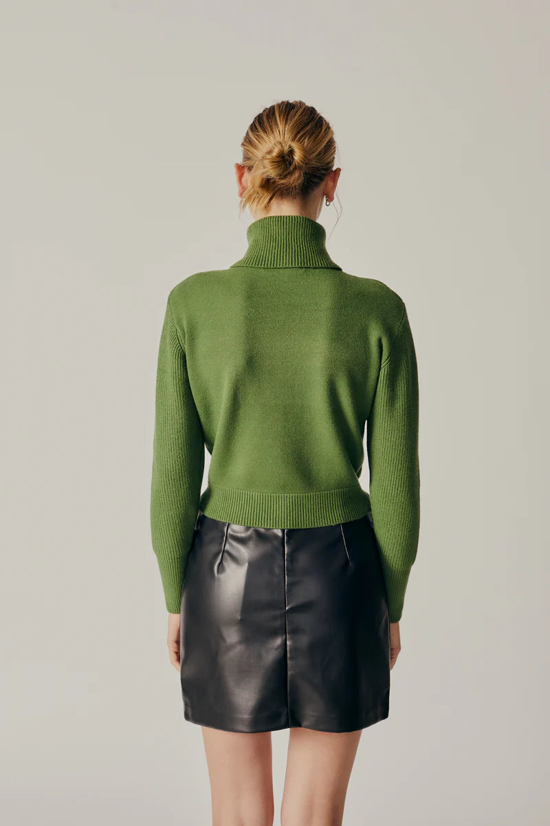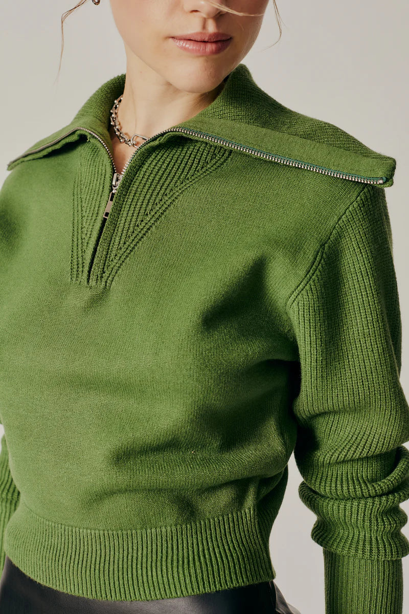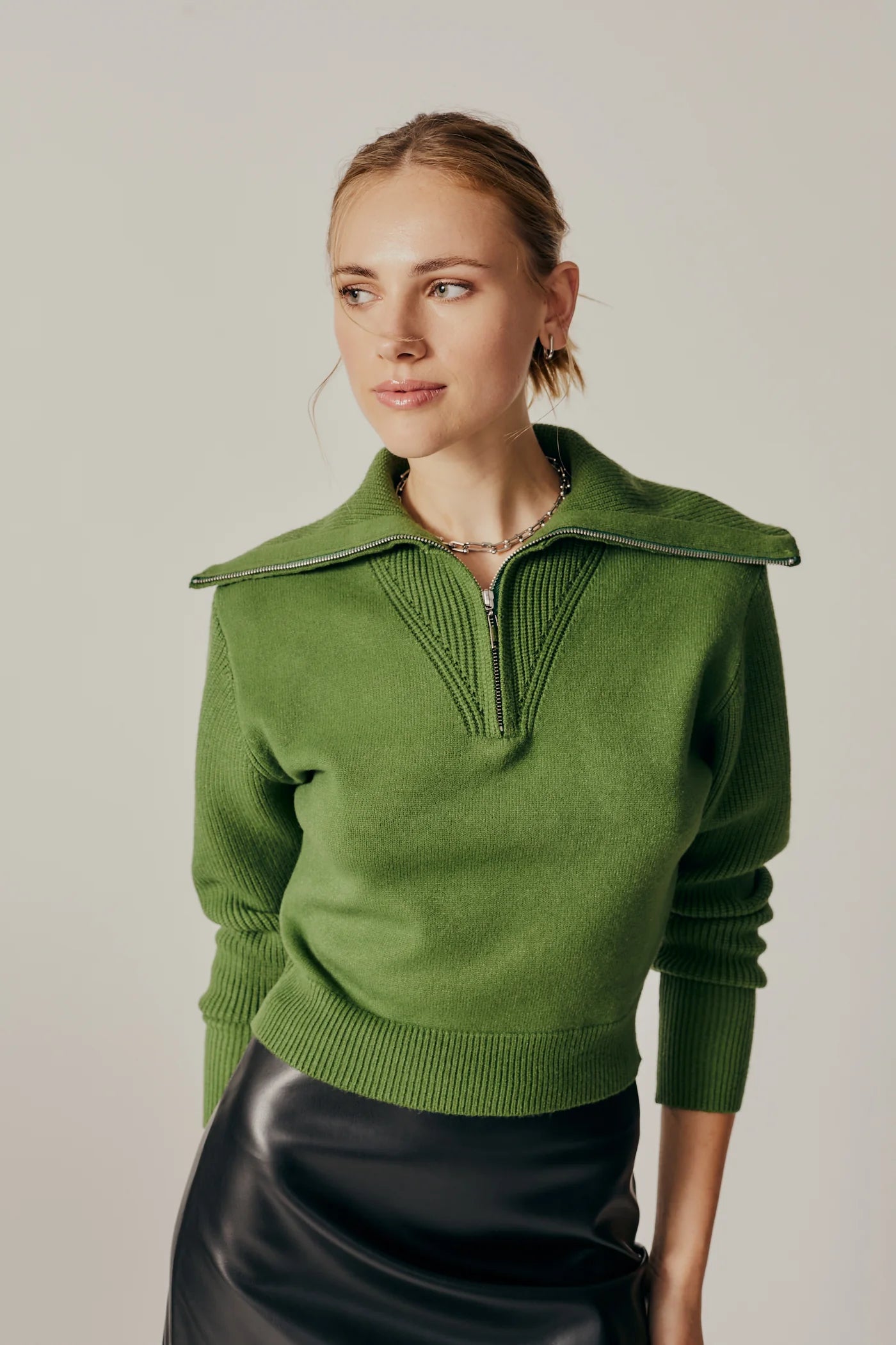 Viscose blend high neck half-zip sweater with long sleeves. Front zip closure