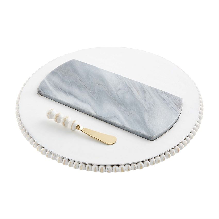 3-piece set. White-washed mango wood serving board features beaded rim and removable marble inset. Arrives with brass finished beaded spreader. Place marble in refrigerator to keep food chilled while on display!