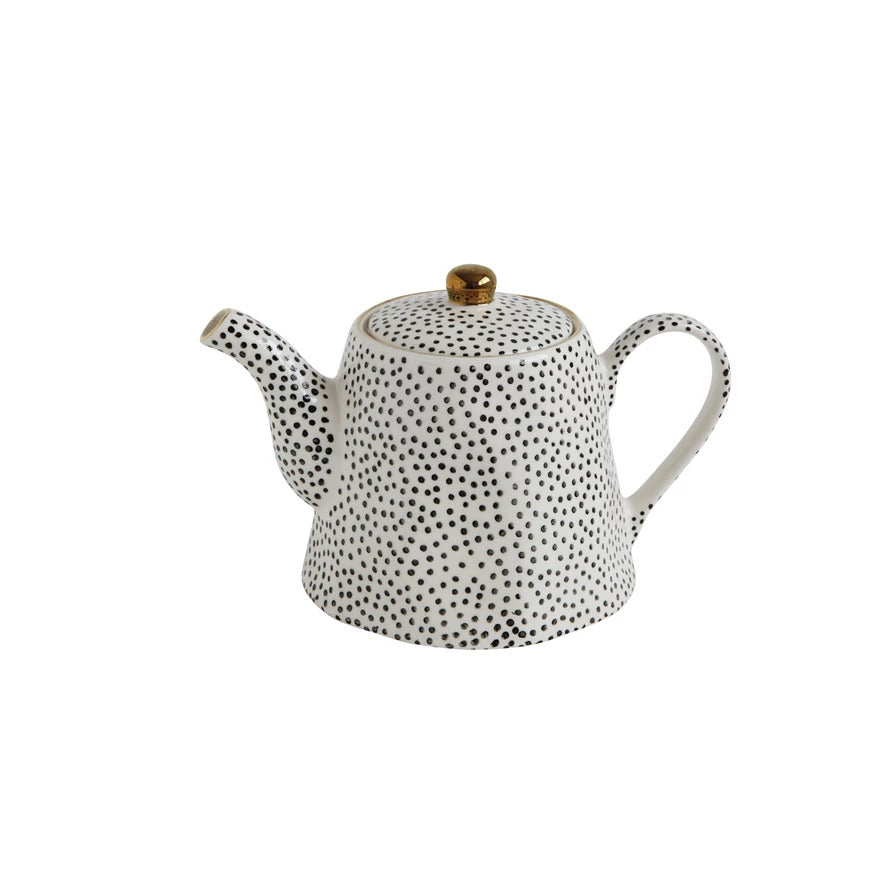 Adorable white teapot with black speckles will add a fun decor to your kitchen. The lid has gold accent which accentuates the gold rim around the pot opening and spout opening. The opening is 2.5" x 4".