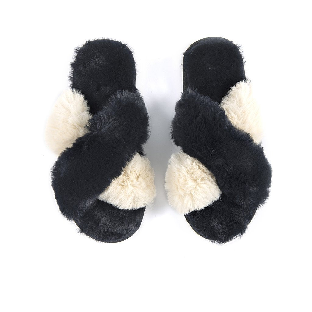 This slipper features a plush texture upon a rubber bottom making them cozy yet sturdy. The Avalon Slipper is open toed and has contrasting crisscross straps in black and ivory adding a bit of sophistication to your new wardrobe favorite. Packaged ribbon wrapped this item makes a great gift option in addition to completing your nighttime solace.