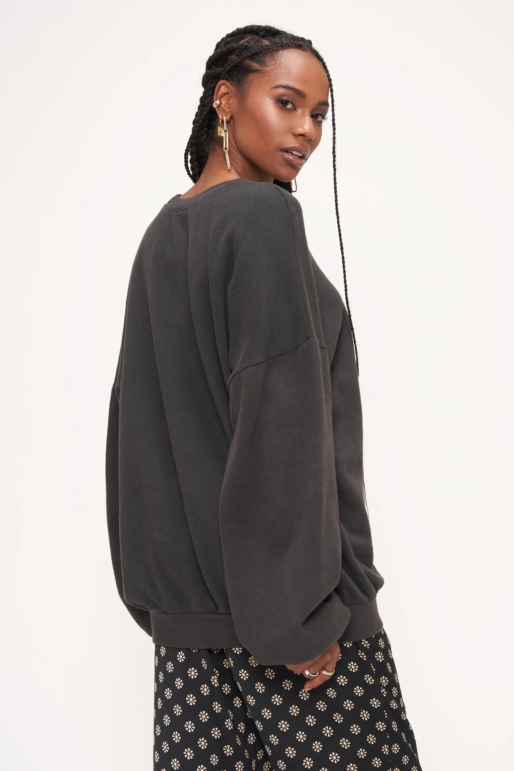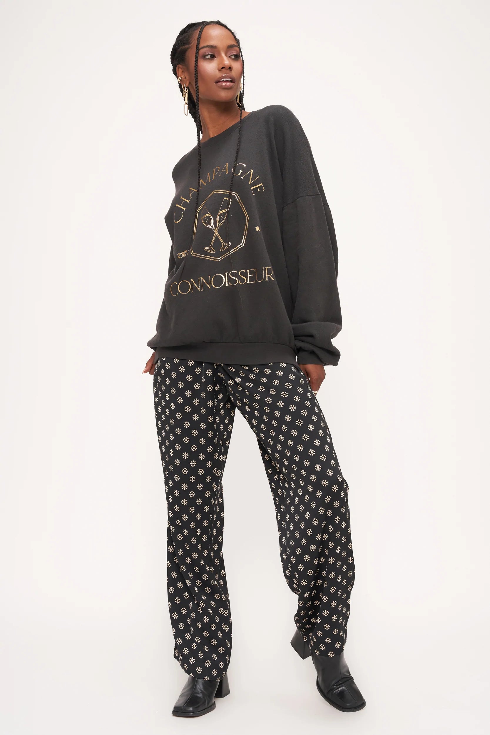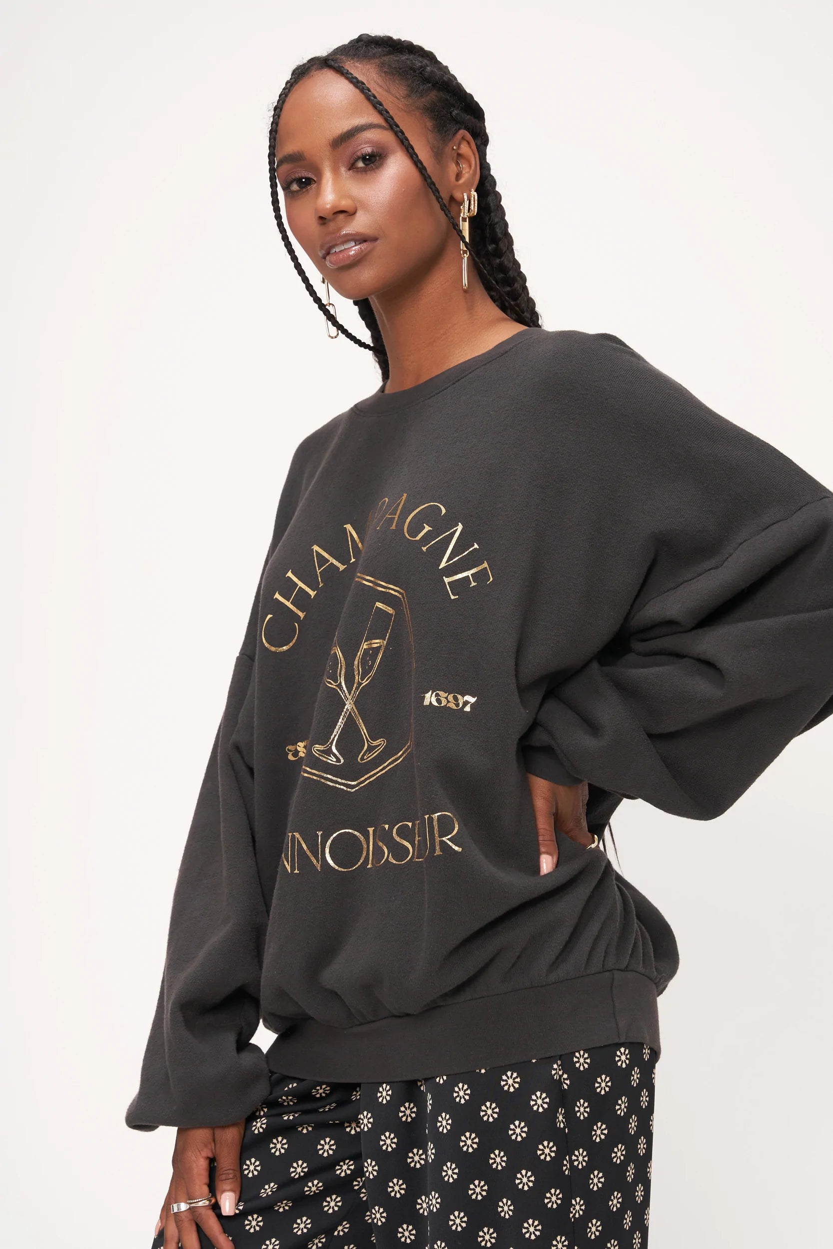The Metallic Champagne Connoisseur Sweatshirt features a relaxed fit made to look well-loved thanks to its washed black dye and super soft fabric. The drop shoulders, rib cuffs, and ribbed bottom and keep this comfortable yet flattering, while the metallic gold graphic really shines... no pun intended.
