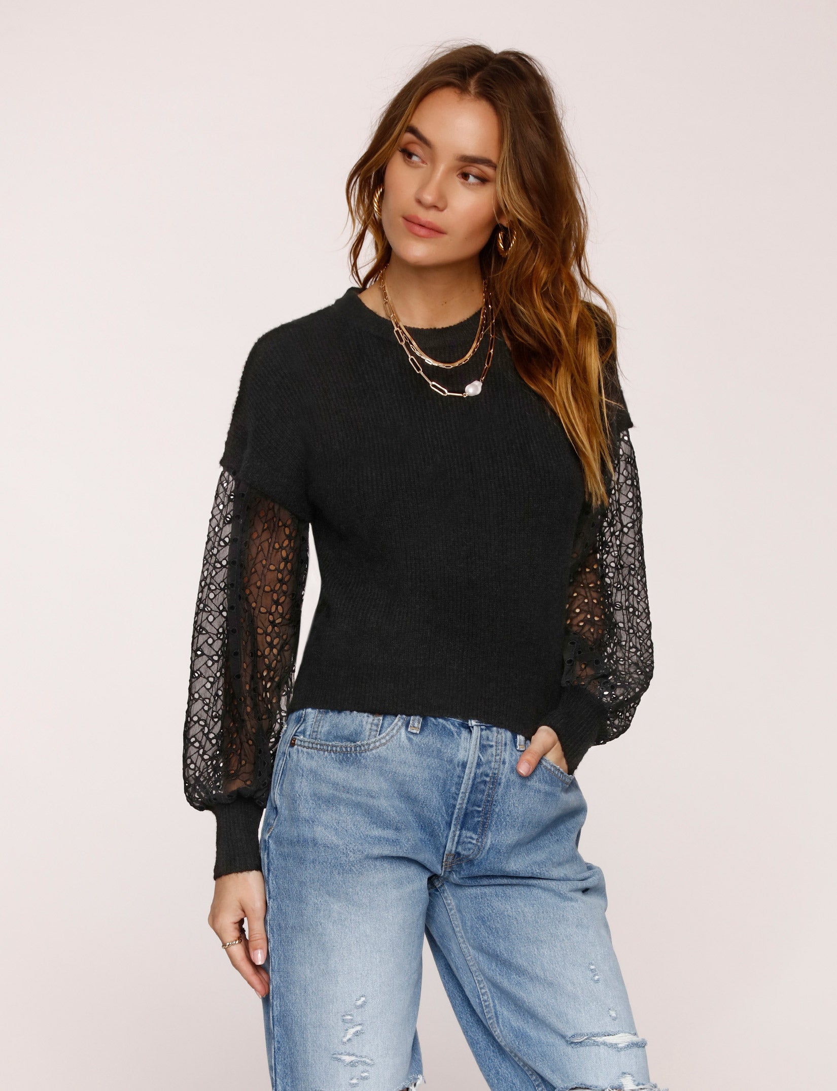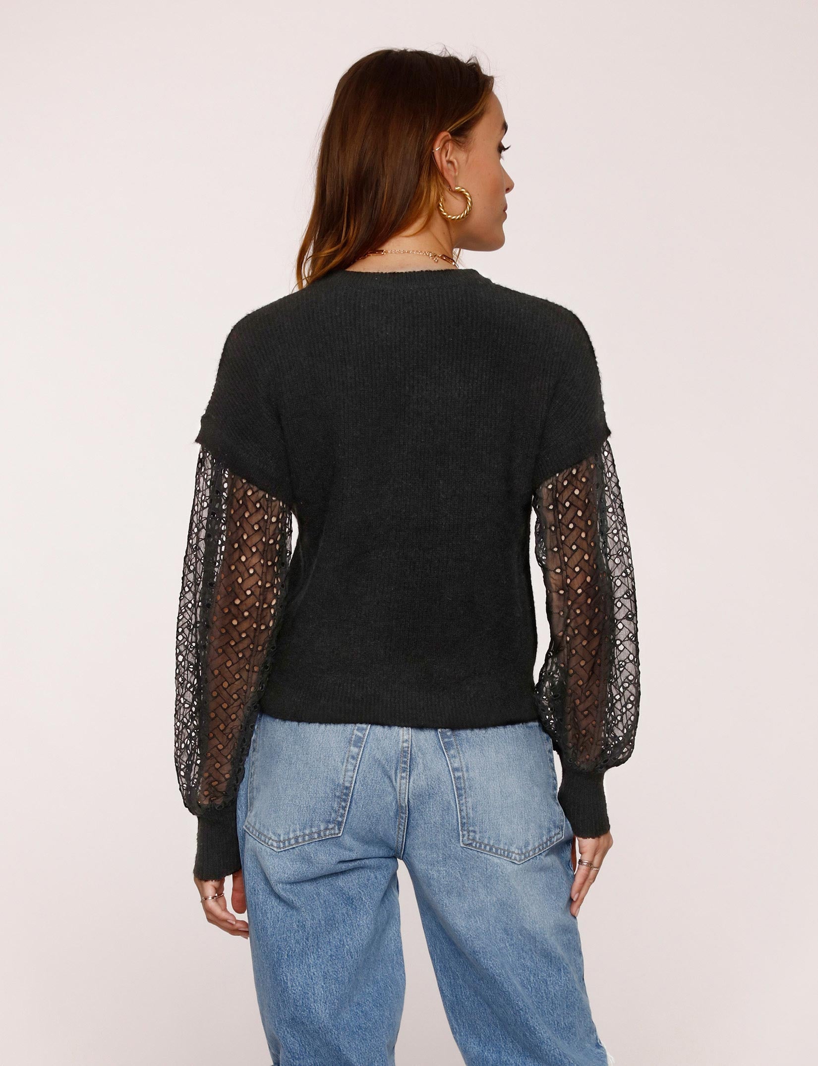 The Dena Sweater is a textured knit with a relaxed fit. It has contrasting eyelet fabric at the sleeves and ribbed sleeve cuffs. Pair it with jeans and over the knee boots for a perfect cold weather look.
