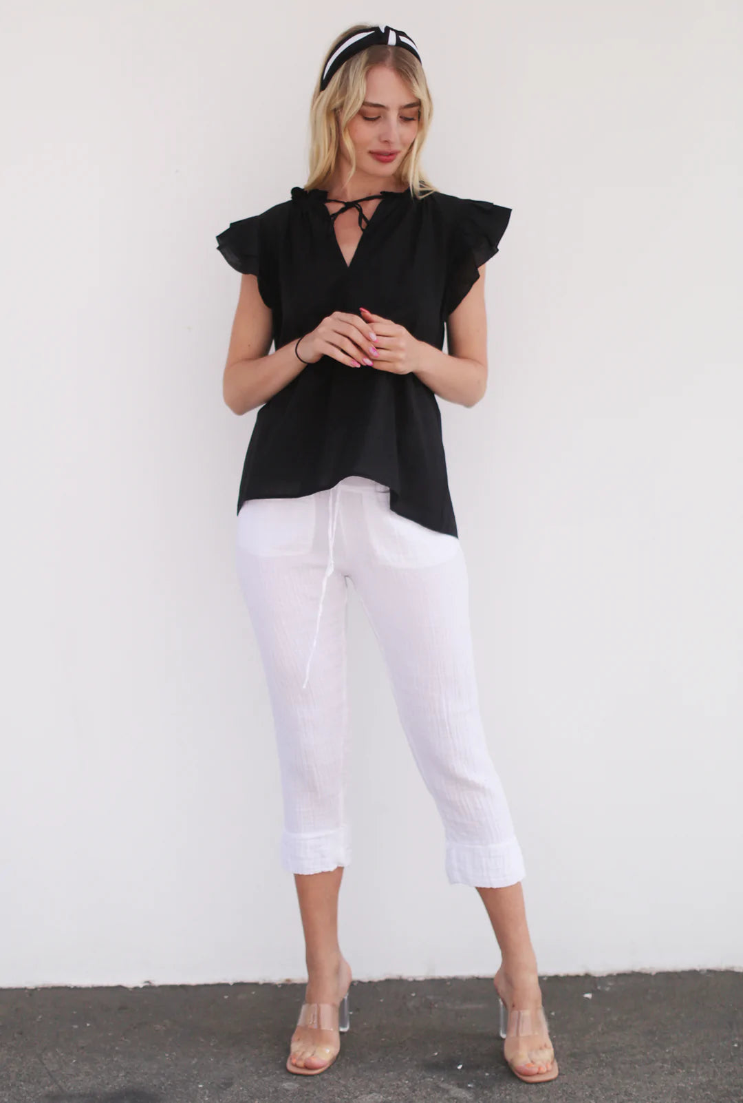 Flirty and feminine, the Dreamy Dress is an easy piece cut from lightweight cotton. Featuring ruffled sleeves and a v neck tie front, pair this back to sandals or sneakers for a stylish, laid-back look.