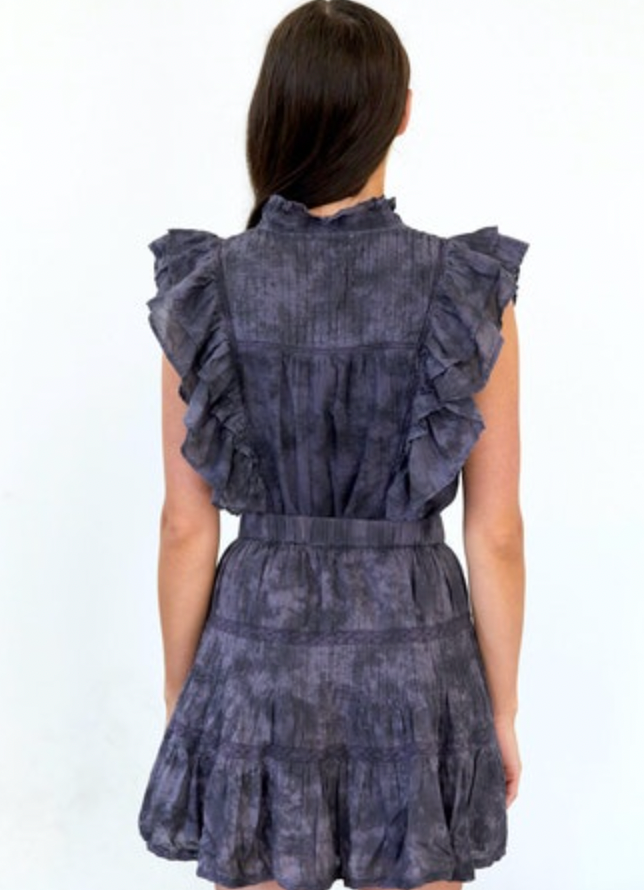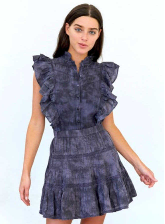 Introducing the newest mini skirt to the family: The Emmie Skirt in garment-dyed black. Quickly a best-seller, this pull on style features an elastic waist and panels of pin-tucking leading into flouncy ruffles. With delicate lace detailing throughout, this airy hand-dyed cotton piece pairs perfectly with the matching Sara Blouse. Mini in length and fully lined.Ā