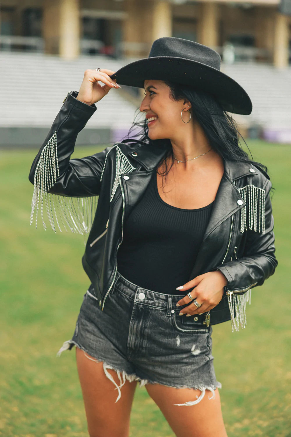 The Rife is a subtle glam lovers dream!! Black leather with bold rhinestone fringe... need we say more?! The Rife features silver hardware to match the silver crystal fringe, shoulder snaps, vegan leather material, and fringe across the wing span. Pair with a basic bodysuit and shorts to let this baby shine!!