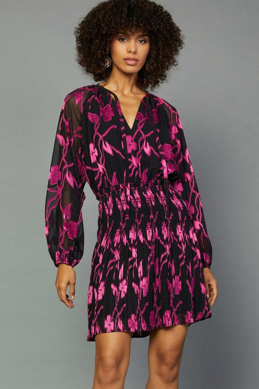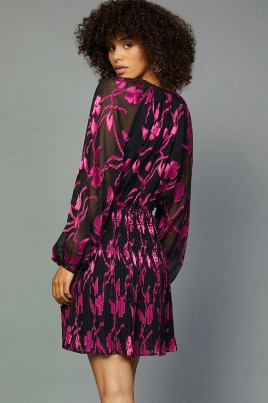 Black/Fuchsia Floral Jacquard Pleated Mini Dress