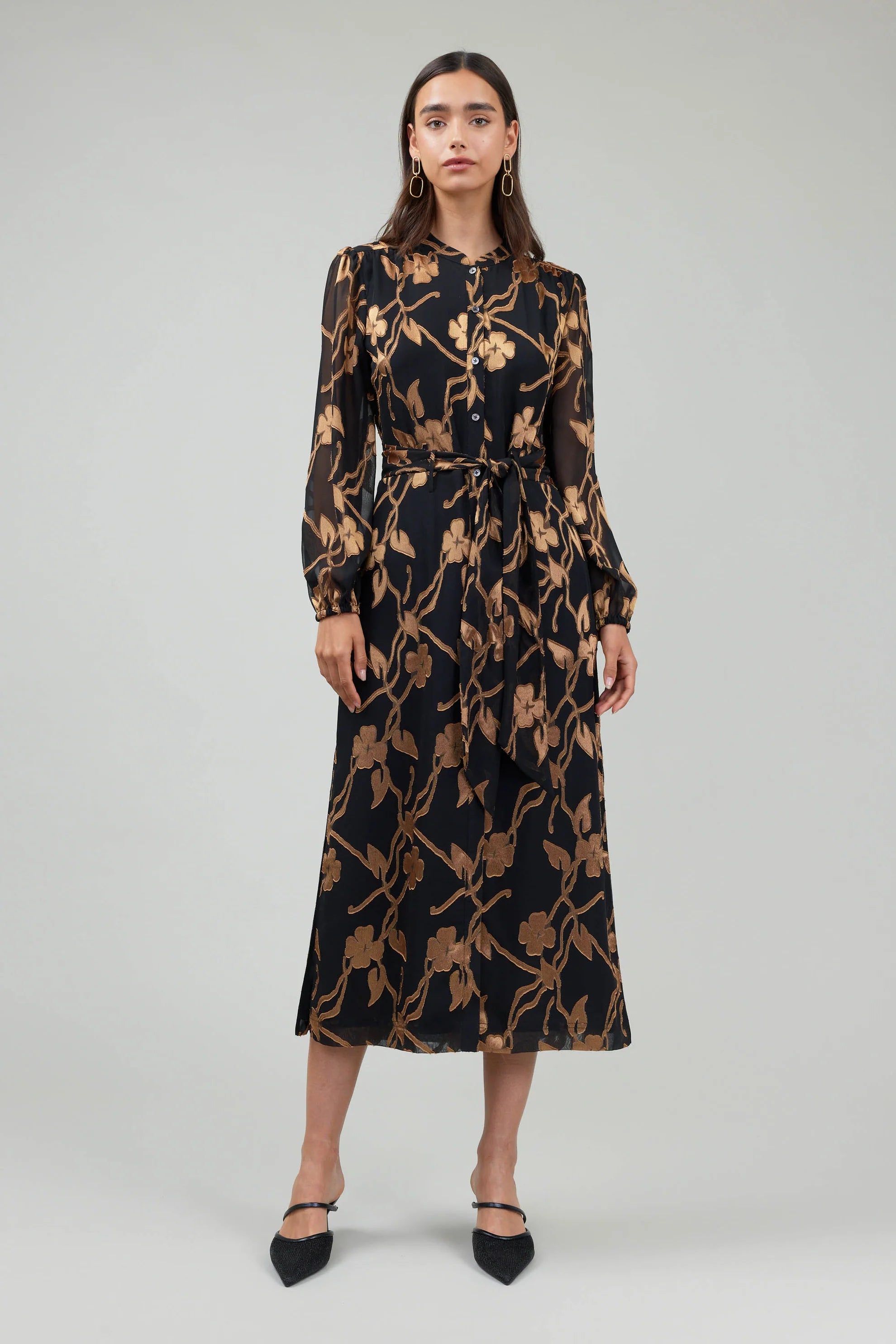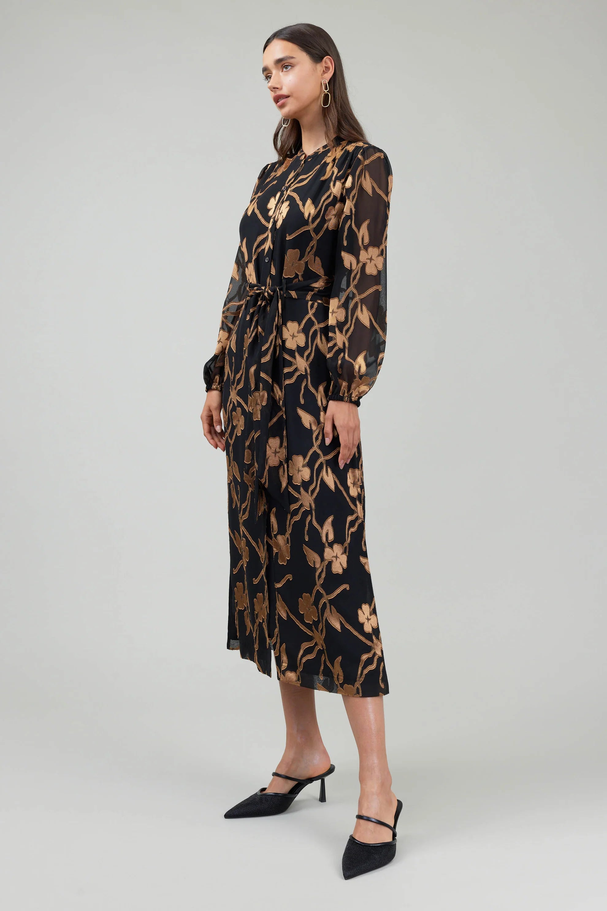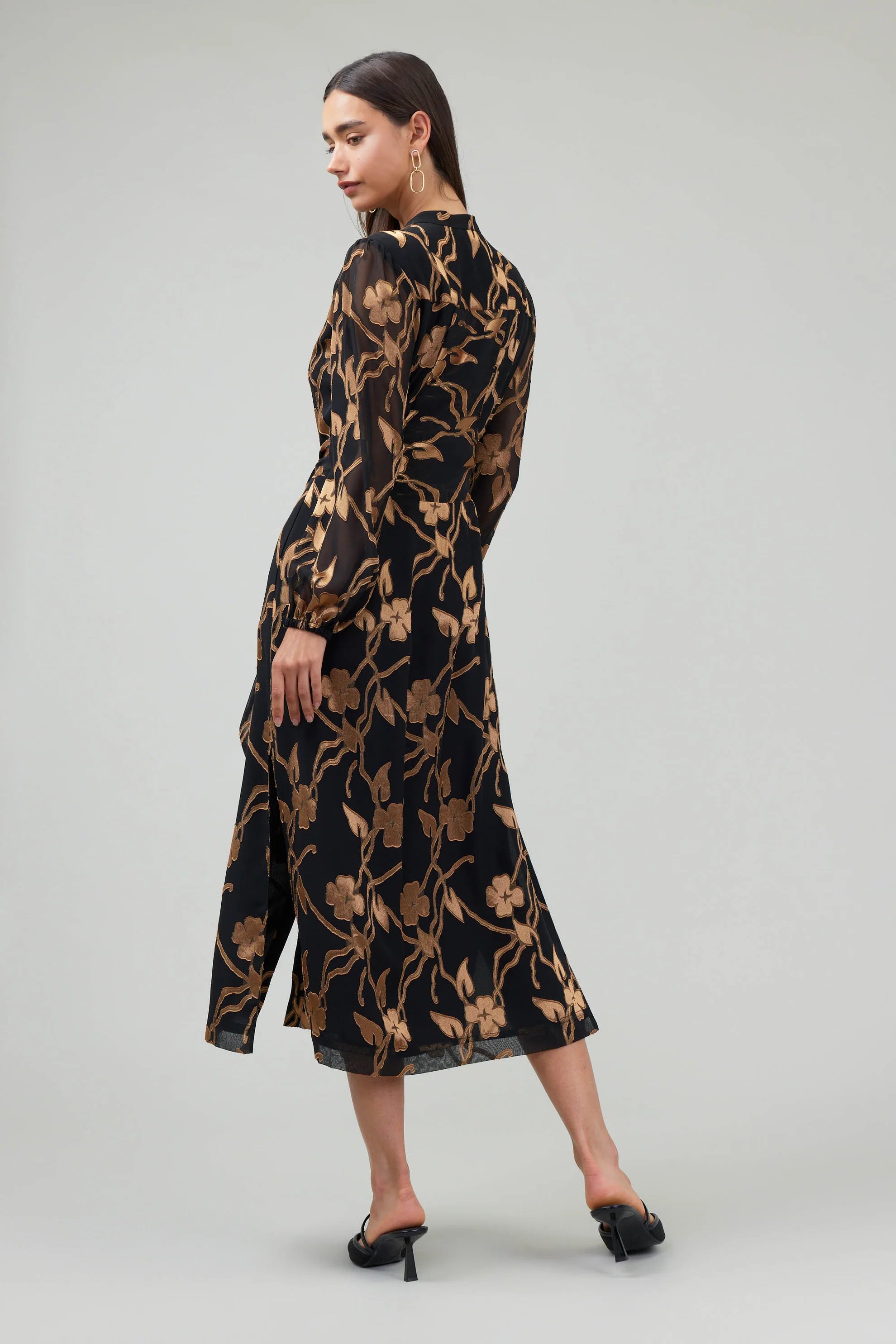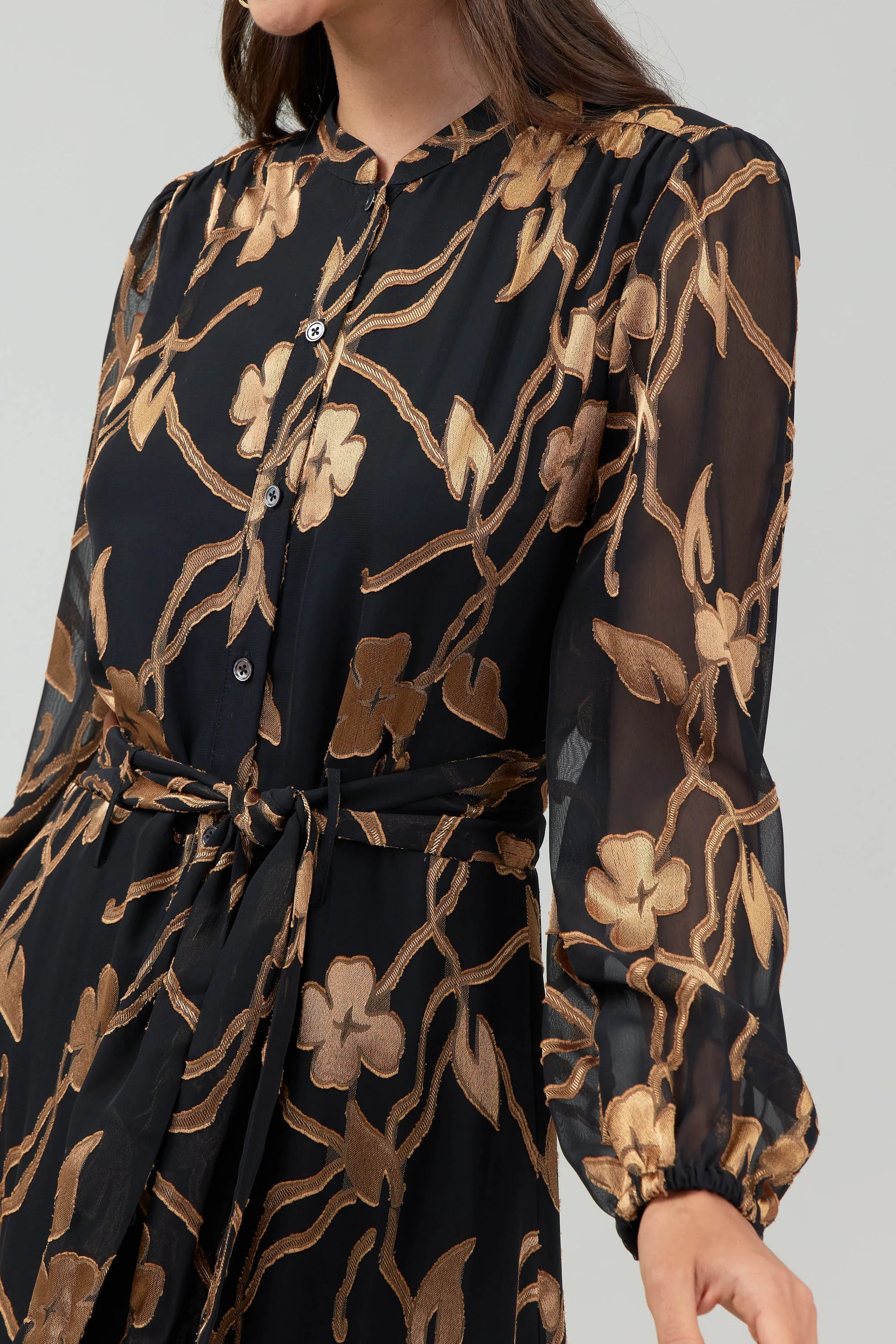 A gold floral motif on black creates drama on this button-up midi dress. Detailed with a stand collar, it's got sheer, puffed sleeves and a tie belt that lets you cinch the shape.