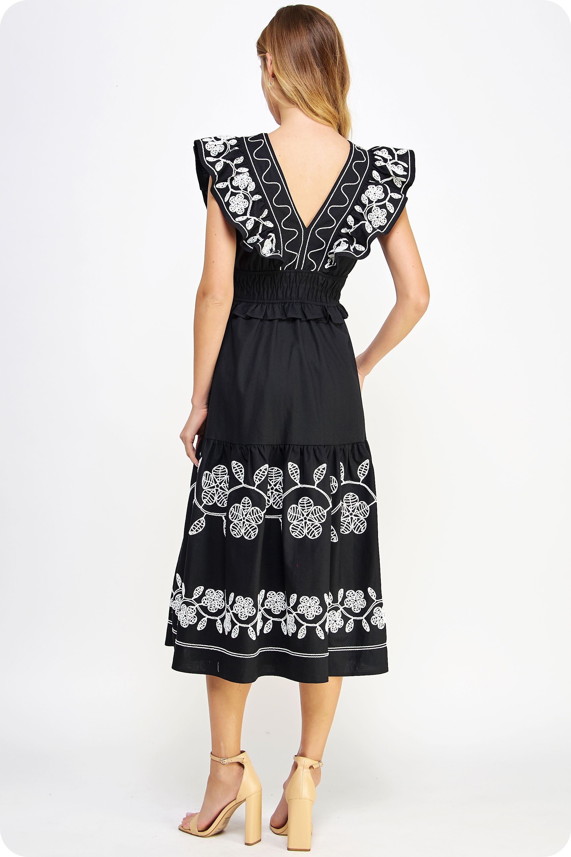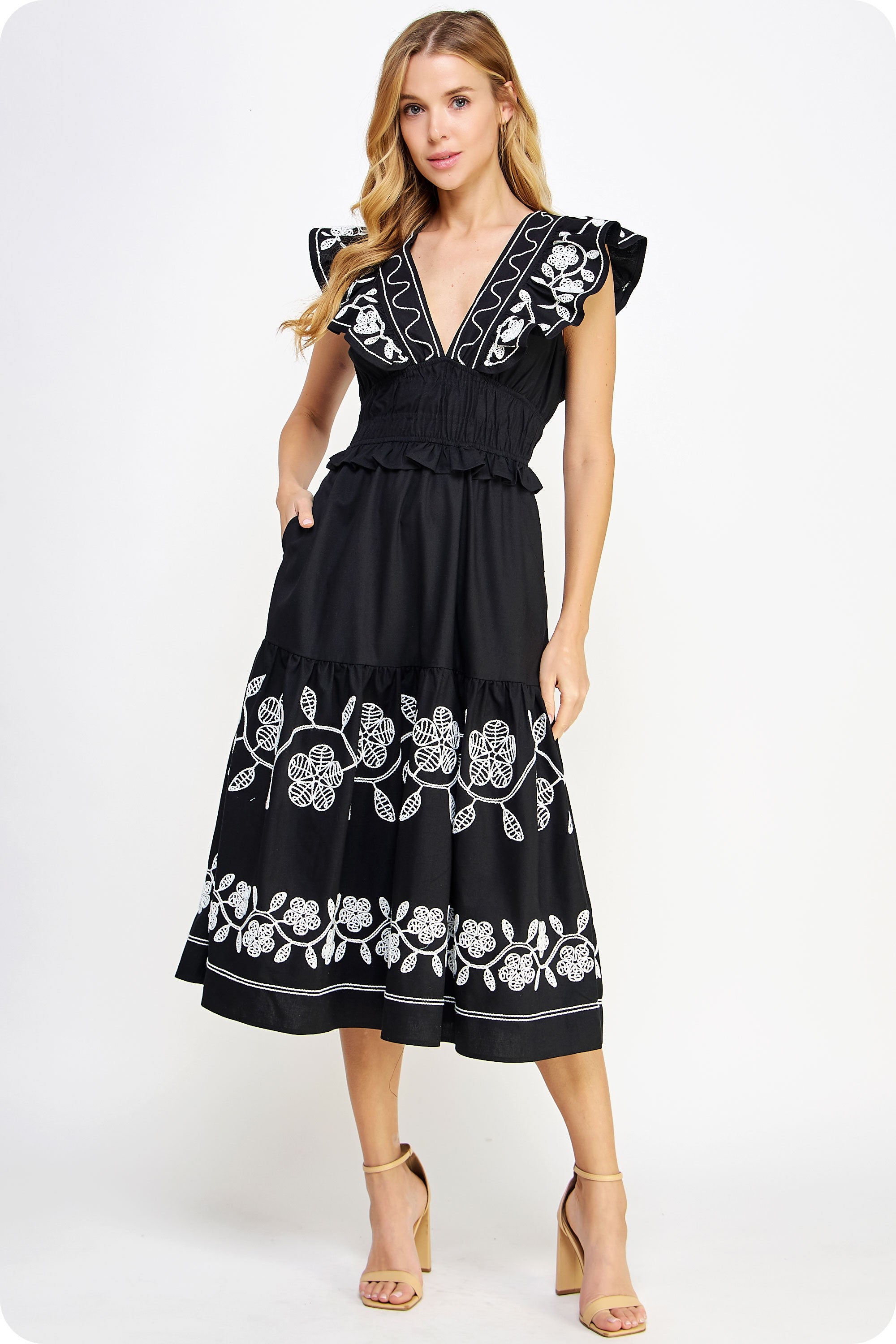 Embroidered ruffled midi dress in linen cotton blend fabric. This sleeveless sun dress features side pockets, a ruffled elasticated cinched waist, an intricate floral embroidery throughout bodice/skirt, lining, and ruffled V neck.