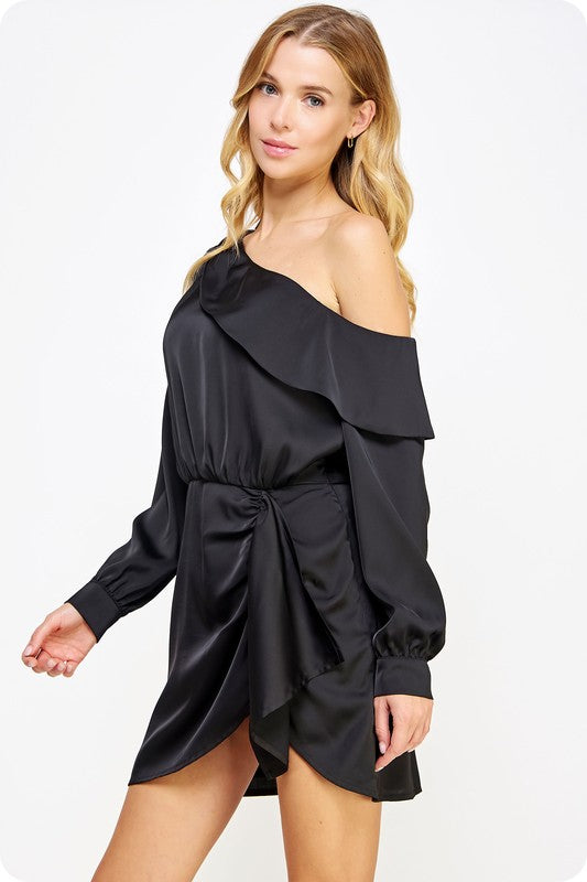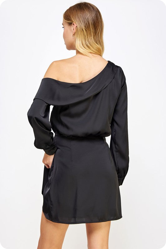 One-shoulder draped satin mini dress. This style features a draped one cold shoulder neckline, long blouson sleeves with button cuff, shirred mini skirt with draped panel detail, lining for comfort, cinched waist with shirring, and hidden side zipper closure.