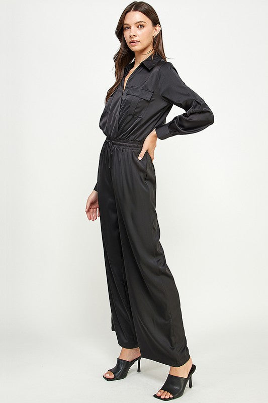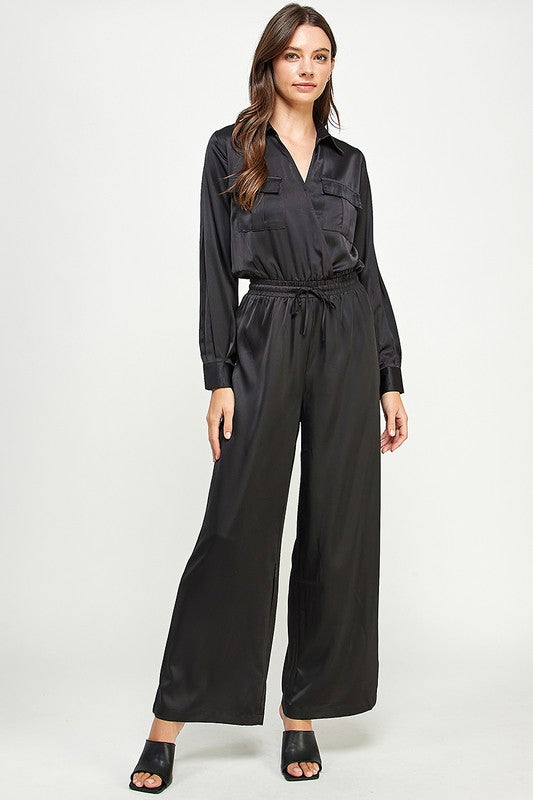 Black L/S Vneck Drawstring Satin Jumpsuit