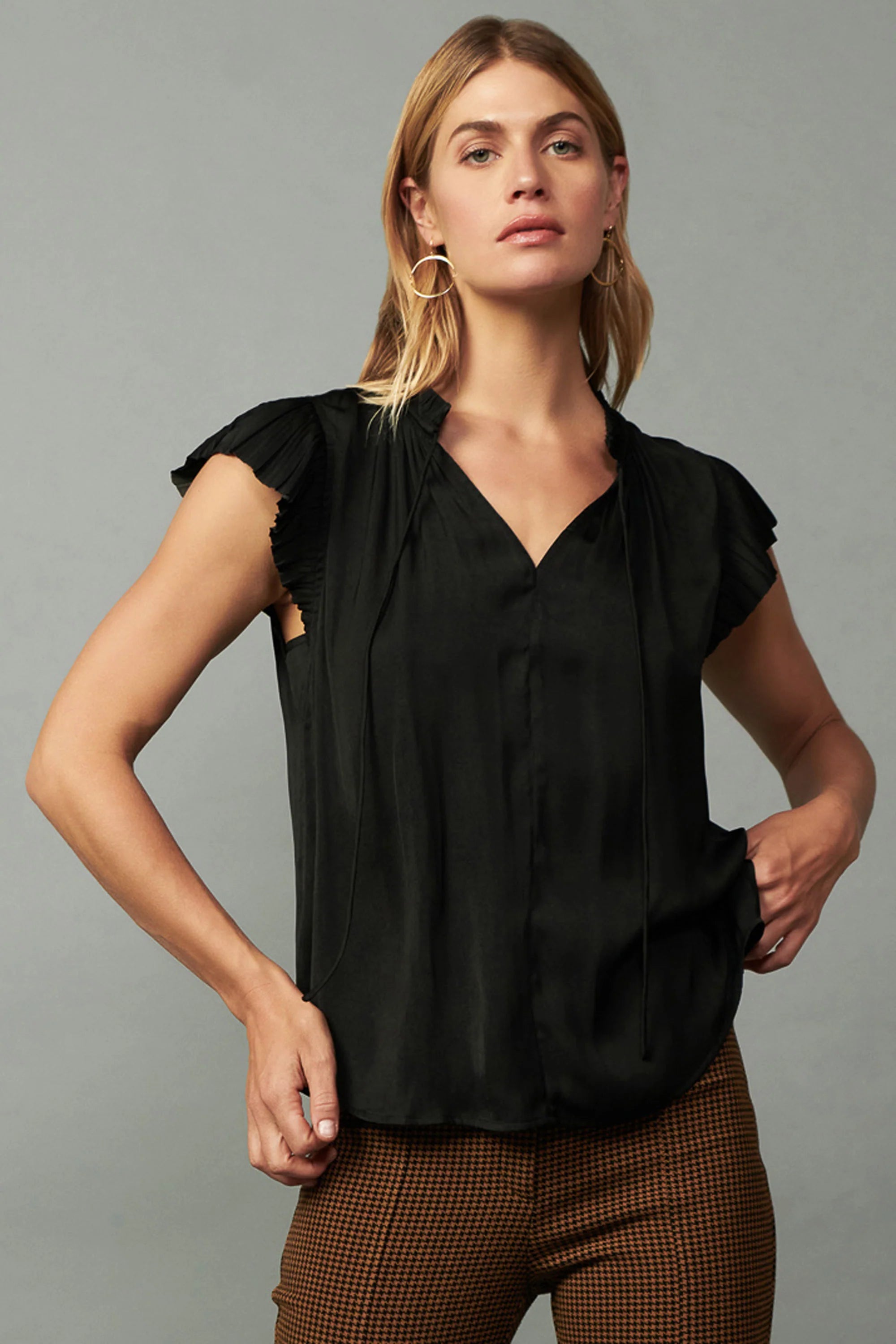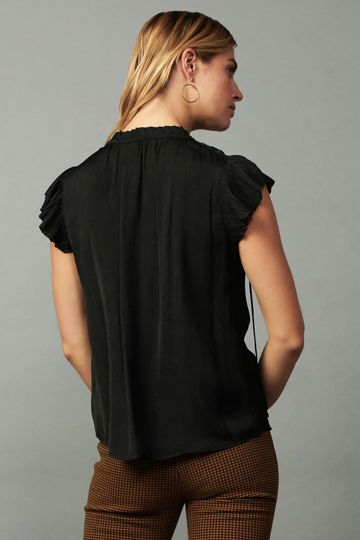 This pleated sleeve top is cut for a loose, easy fit and features a flattering split neckline with ruffle trim and tie detailing. A new favorite for your everyday wardrobe