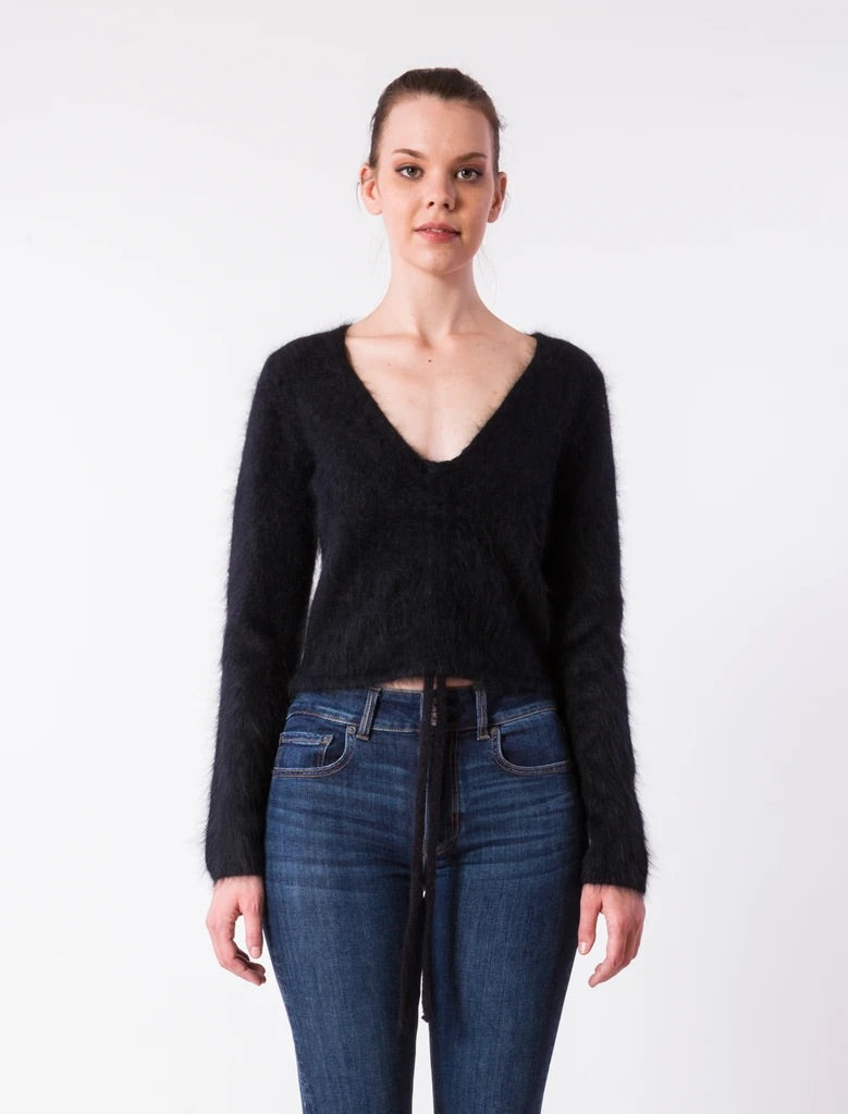 Fitted V-neck cropped top with adjustable CF drawstring and slit at 3/4 sleeve slit in "angora cloud fuzz"yarn